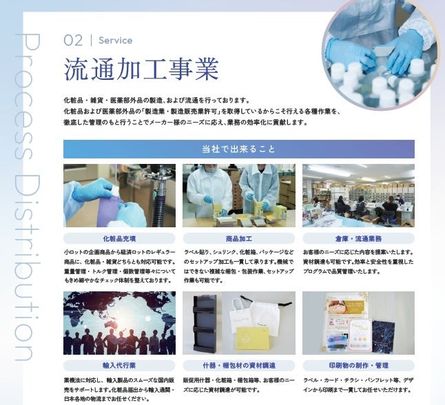 近年では、化粧品や雑貨の製造(充填、梱包、加工等)から出荷までをワンストップで担う流通加工事業、また「からだの内側から美と健康にアプローチする」ビューティー事業など、少しずつ事業範囲も拡大しております。