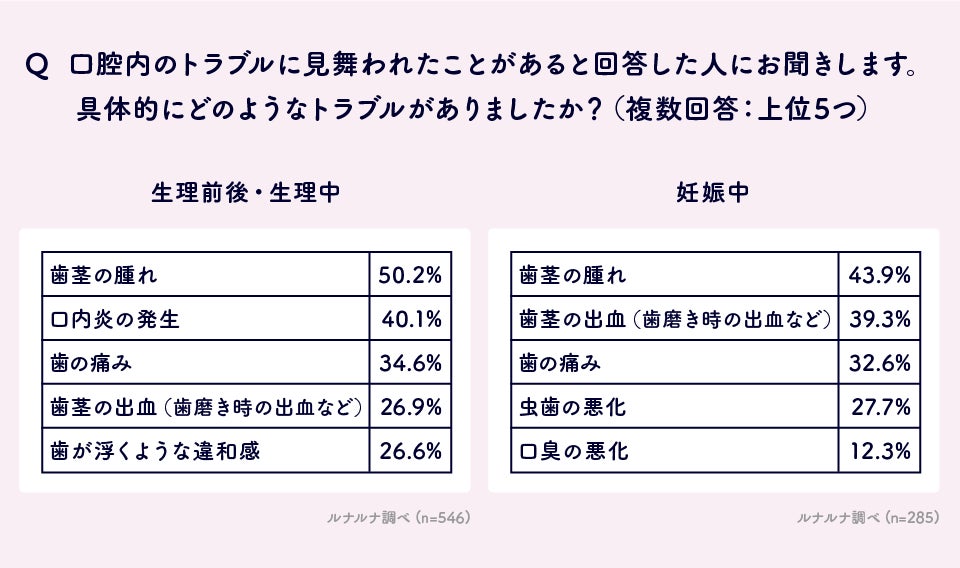 ~生理前後・生理中、妊娠中にそれぞれ約5人に1人が口腔内トラブルを経験!約7割は女性ホルモンと口腔内トラブルに関係があることを「知らない」と回答~