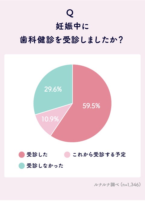 実際に妊娠中に歯科健診を受診した人は59.5%、これから受診する予定の人は10.9%、受診しなかった人は29.6%でした。歯科健診の受診が推奨されていることを知っている人は約9割いるにもかかわらず、受診していない人が一定数いることがわかります。