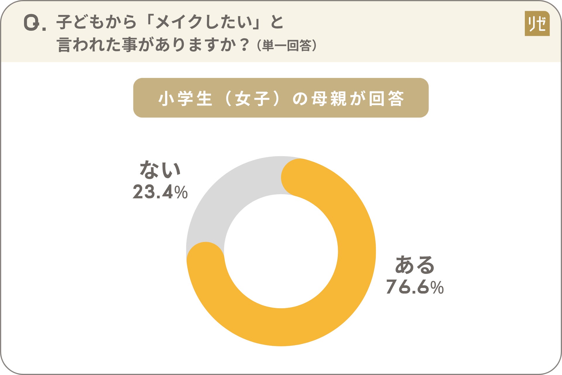 実際に、「言われたことがある」と回答した母親は76.6%にのぼり、メイクに興味を持つ子が非常に多いことがわかる。