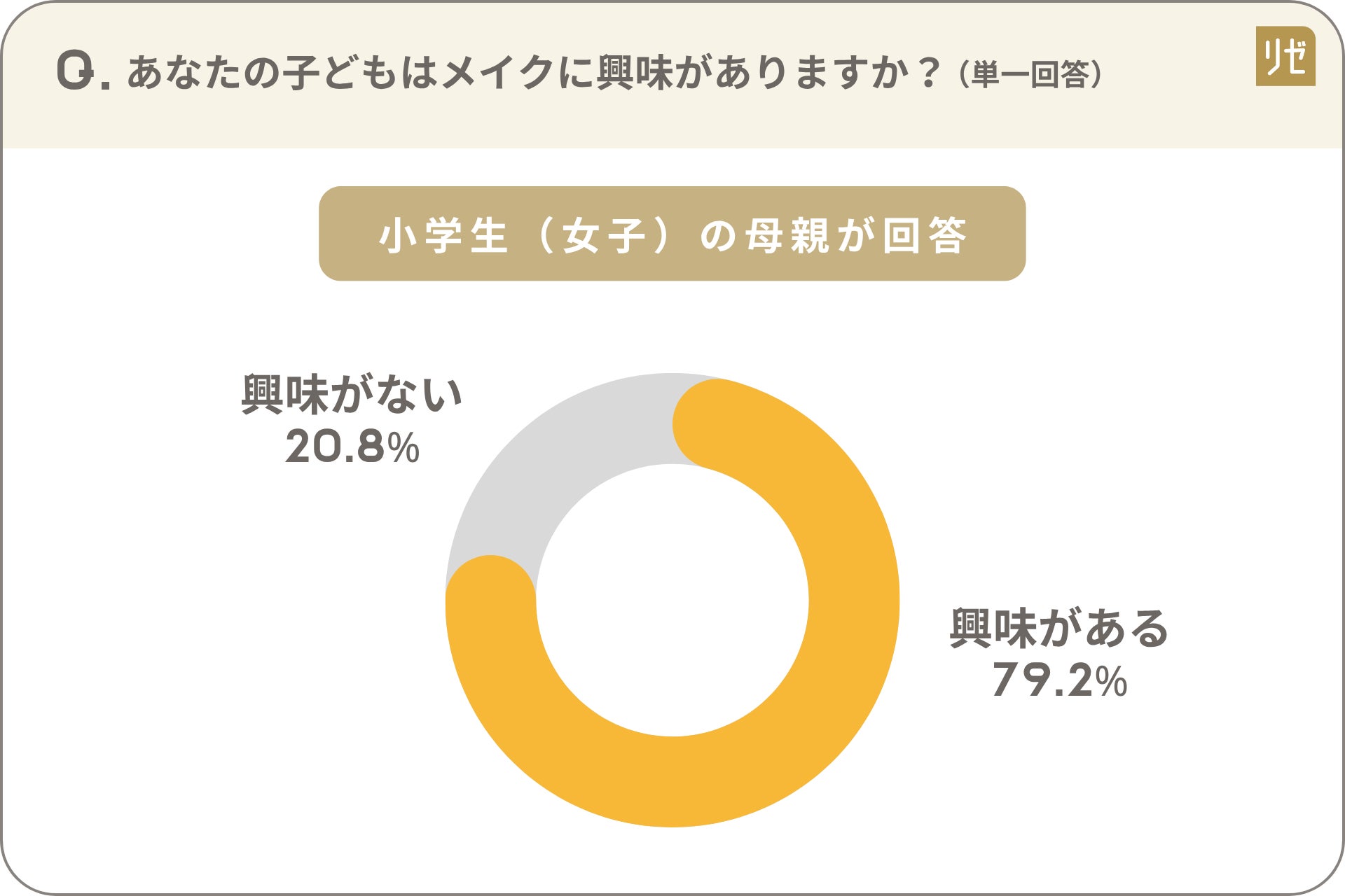 子はメイクに興味があるか? の問いに8割(79.2%)の母親が「興味があると思う」と回答。小学生という年齢にもかかわらずメイクに興味を持っている割合が高いことから、現代の子どもたちの間で美容に対する意識が高まっていると考えられる。