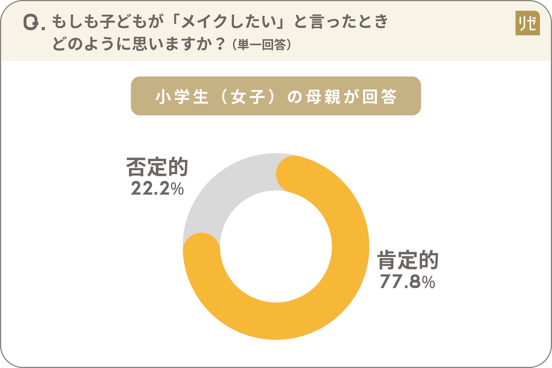 実際に、子から「メイクしたい」と言われた時どう思う?に対し、8割の母親が「肯定的」な意見を持っていることが判明(77.8%)。 一昔前に比べ、子どものメイクに対する親の意識が変化してきている兆しもうかがえた。