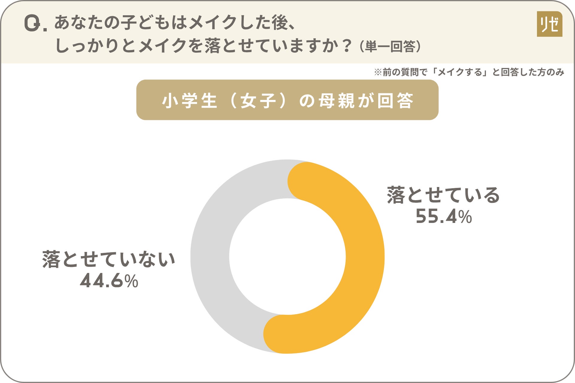 メイクをしている子はメイクをしっかり落とせているか?の問いに、母親の4割「落とせていない」と回答(44.6%)。小学生でメイクをする場合でも、正しいクレンジング方法を教える必要性があることが判明した。