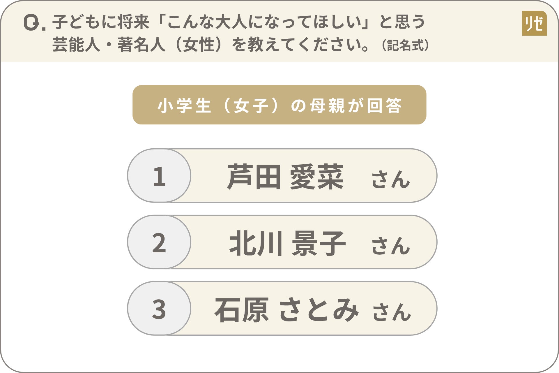 ●【小学生(女の子)の母親が選ぶ!こんな大人になってほしいと思う芸能人・著名人(女性)は?】トップ3