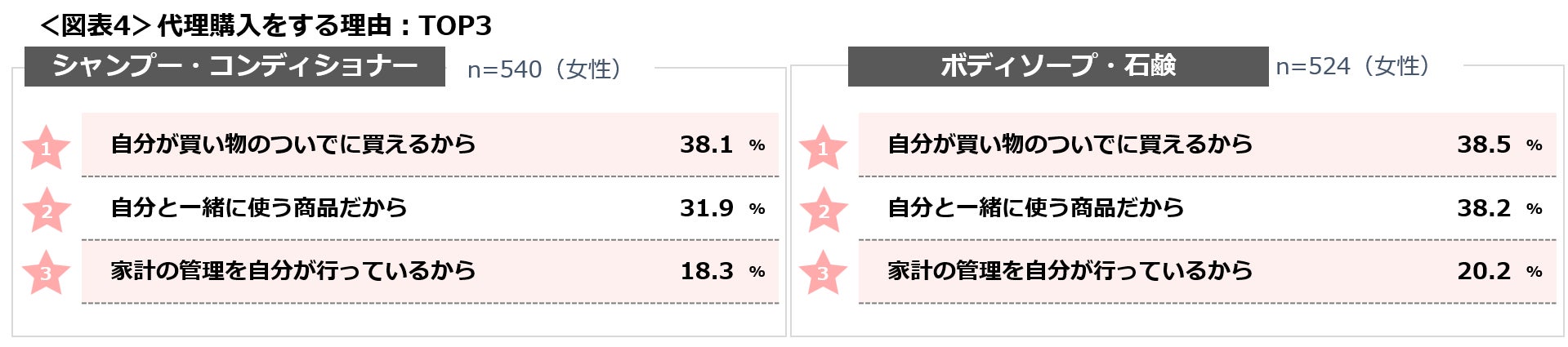 また、「自分と一緒に使う商品だから」という理由もボディソープ(38.2%)やシャンプー(31.9%)で高く、共用性が代理購入のひとつの要因となっています。(図表4)