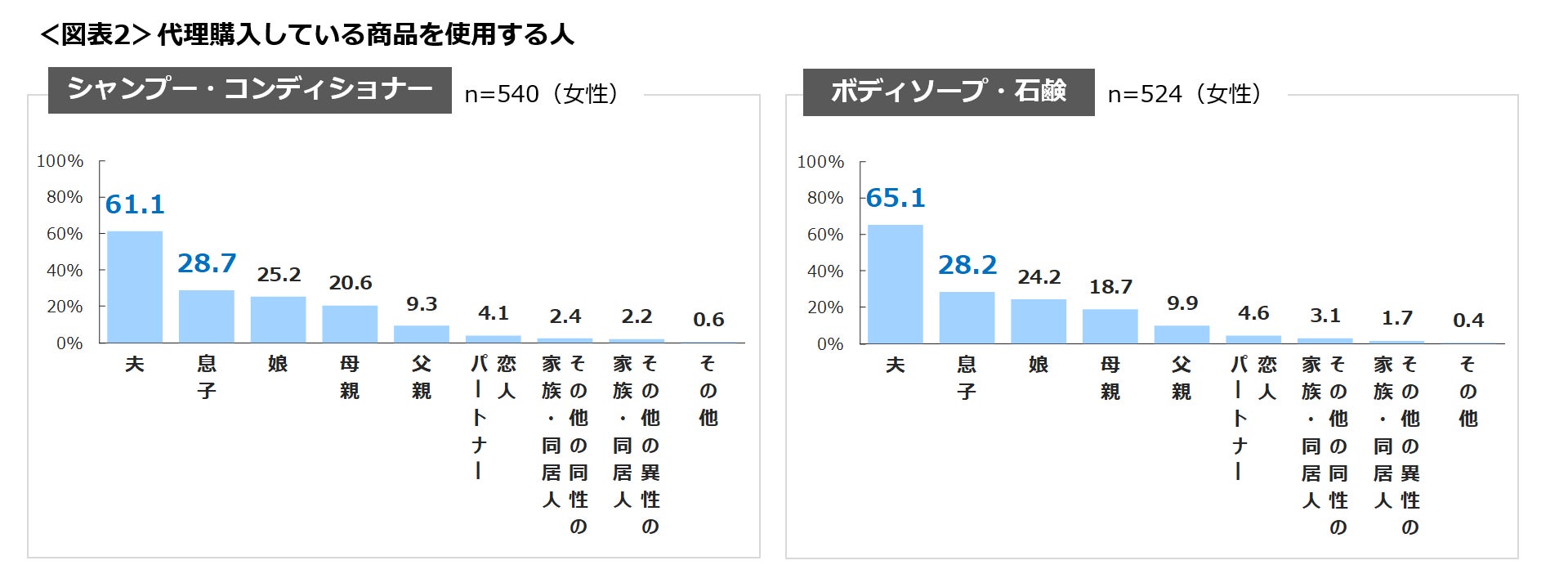代理購入している商品の使用者としては夫が最も多く、シャンプー・コンディショナーでは61.1%、ボディソープ・石鹸では65.1%を占めています。また、息子のための購入もそれぞれにおいて約3割(シャンプー28.7%、ボディソープ28.2%)でした。(図表2)