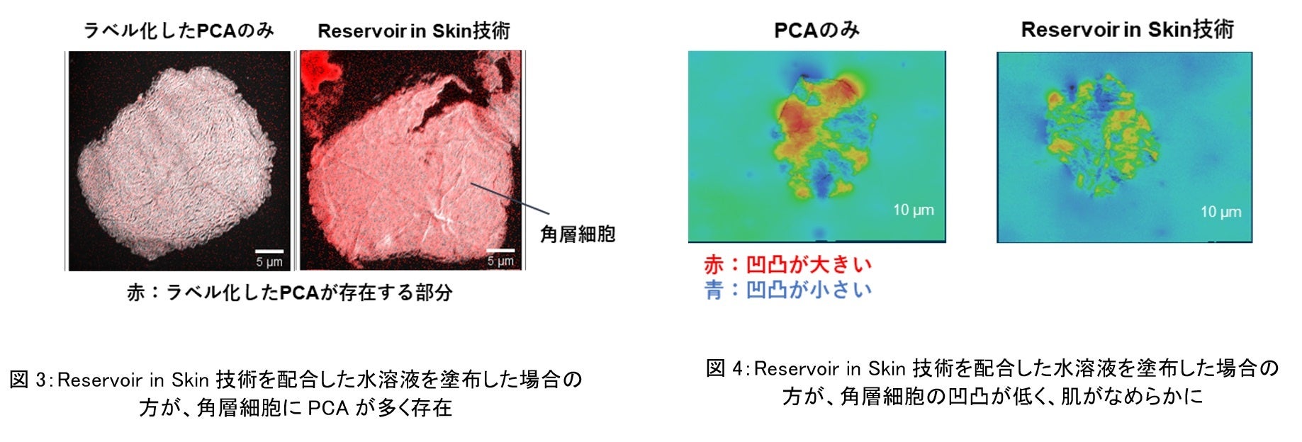 皮ふ内成分分布可視化技術を用い検証を行った結果、本技術により、PCA単独に比べ、両親媒性物質とPCAの複合体を塗布した場合の方が、角層細胞に多くPCAが存在することが分かりました(図3)。また、複合体を塗布した場合、角層細胞の凹凸が低減し、肌がなめらかになることも確認されました(図4※6)。