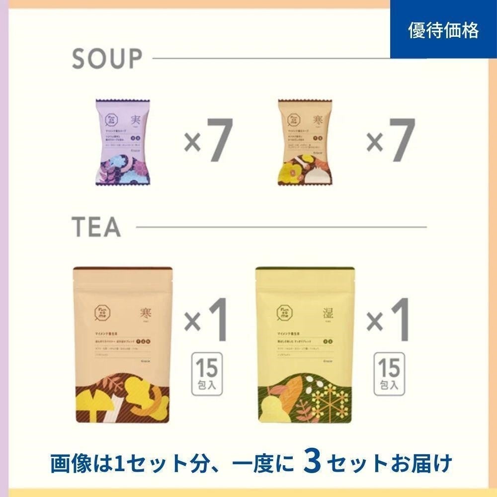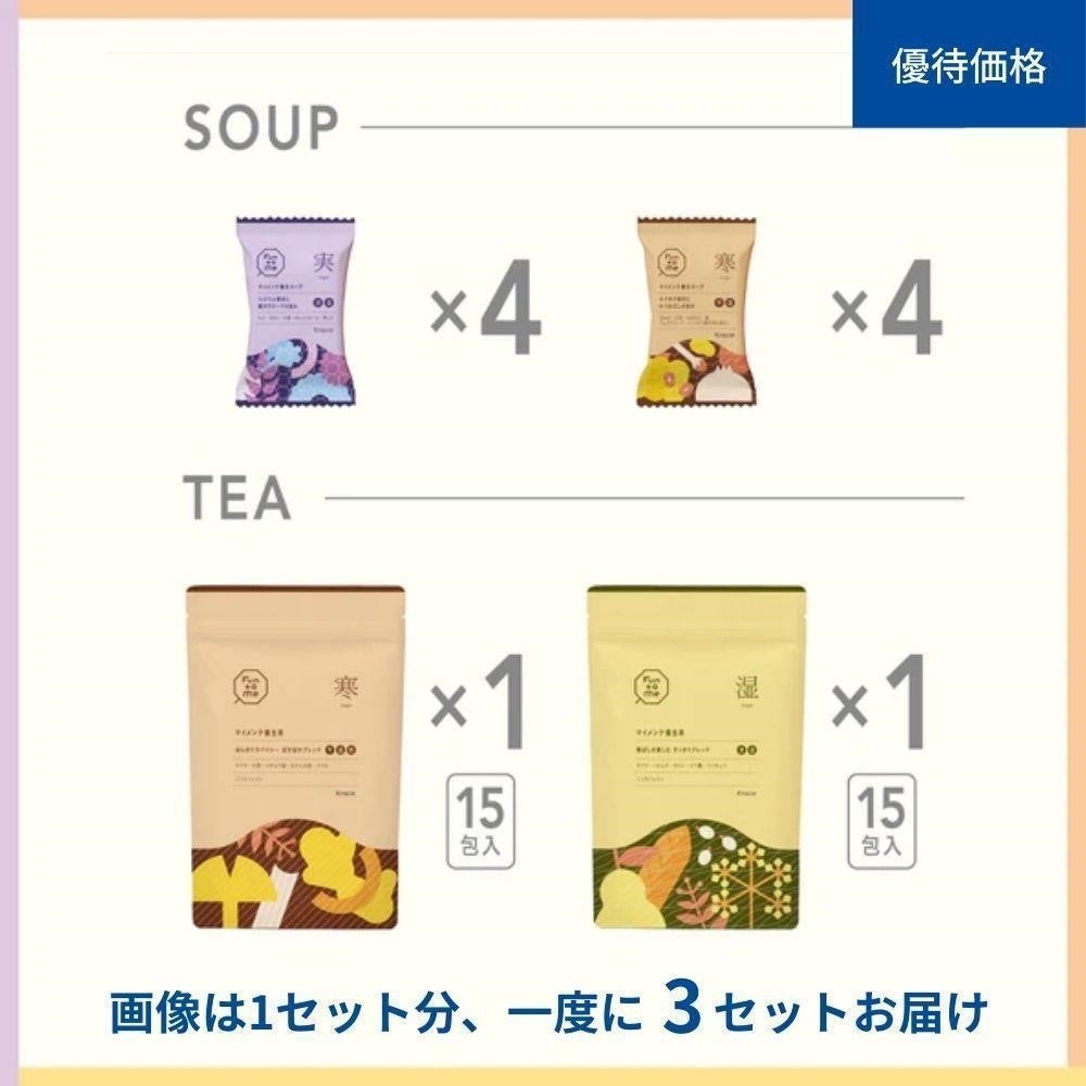 「Fun to Me」は通常、「マイメンテ養生スープ」と「マイメンテ養生茶」、LINEでの健康アドバイスをセットで販売していますが、今回は人気商品「マイメンテ養生スープ&養生茶」のみお試しいただける限定セットを展開します。サブスクリプションサービスで通常展開している「ライトコース」・「しっかりコース」のスープとお茶が、3回分まとめて届く限定セットで、自身のバランス状態にあった8タイプから選べます。温かい水分補給と自身のバランス状態に合った素材を、継続して取り入れる習慣をサポートします。