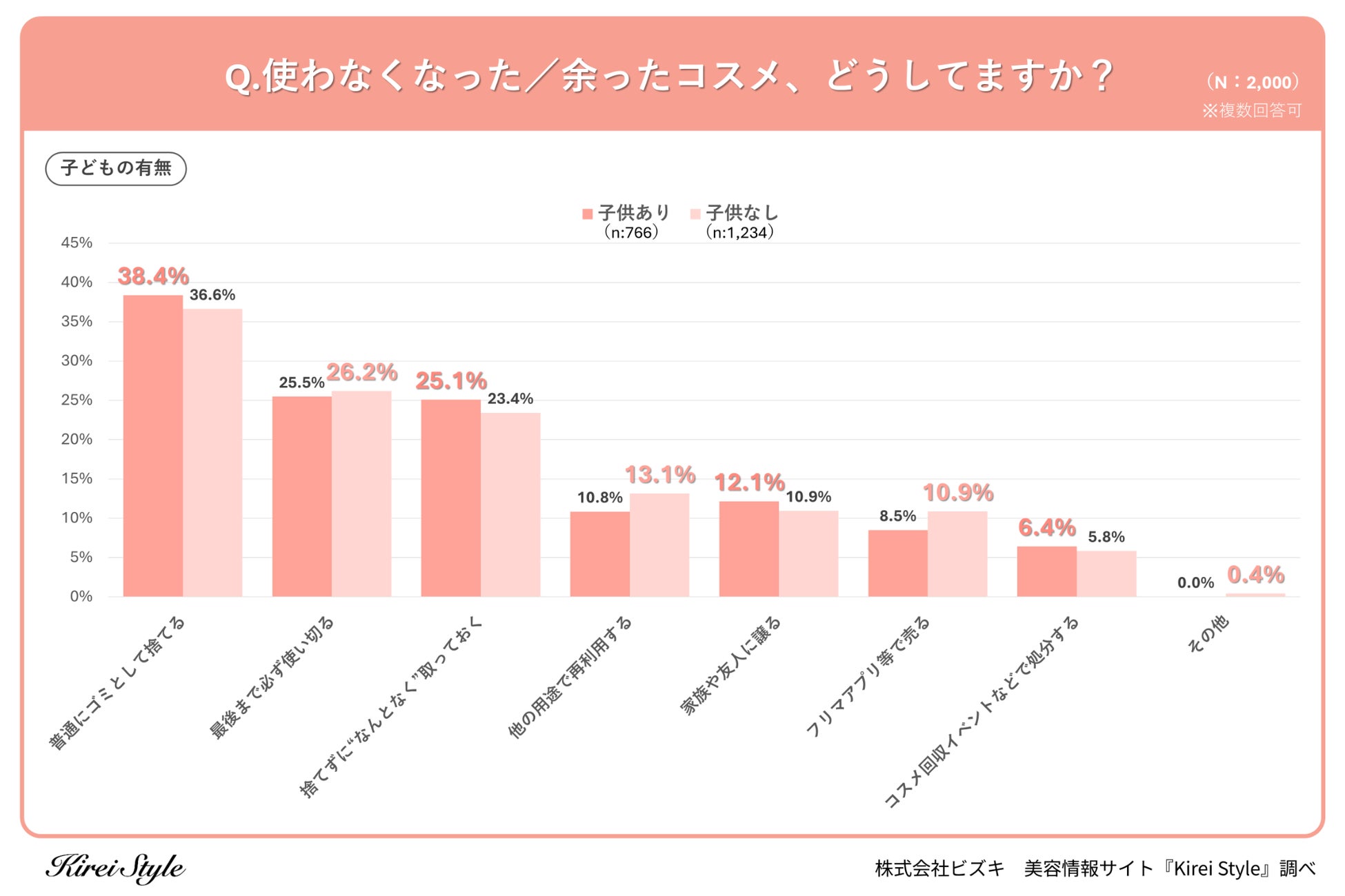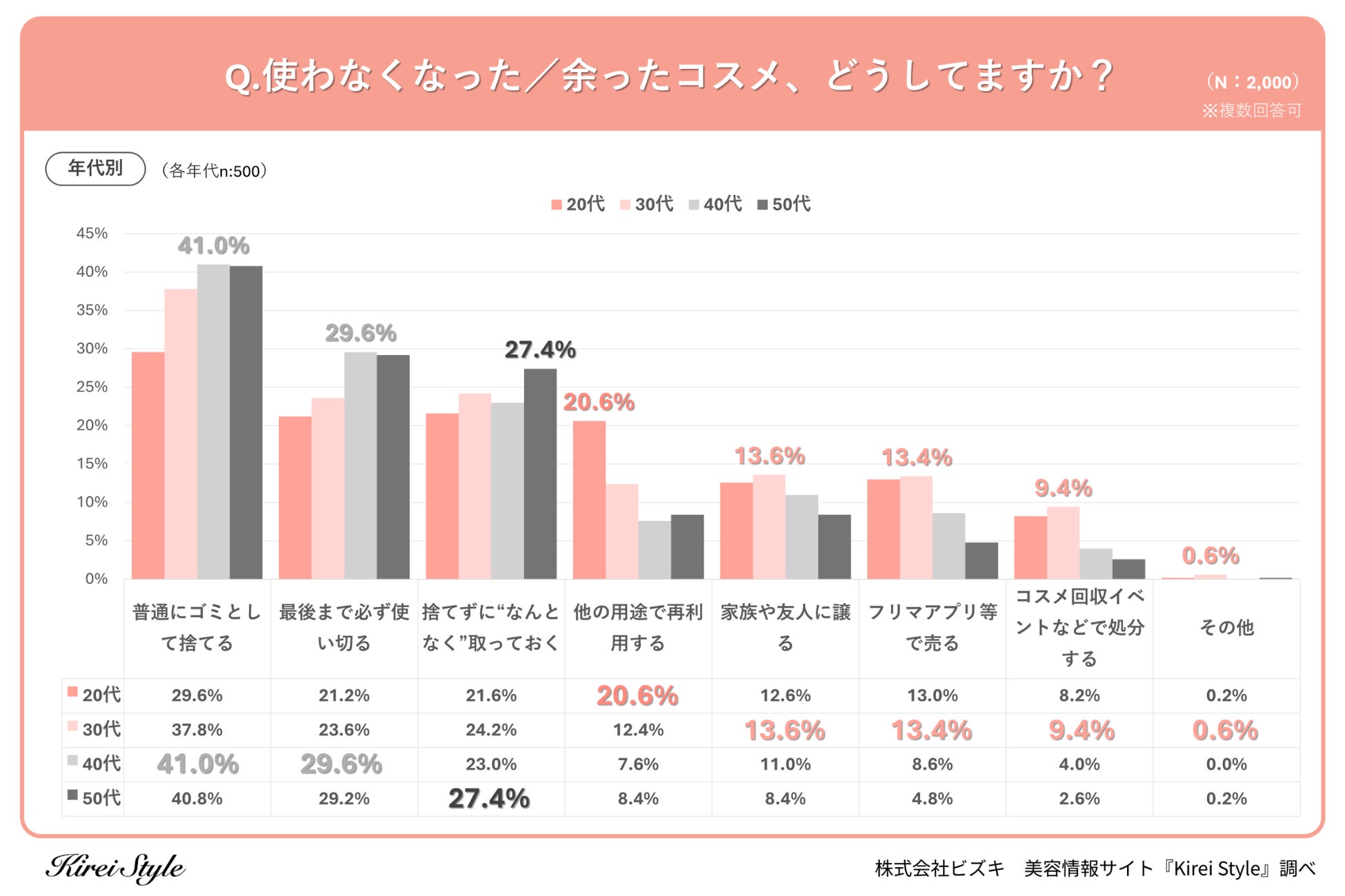 年代別に見ると、どの年代でも「普通にゴミとして捨てる」という方が最も多くなりましたが、20、30代では「売る・譲る・再利用」といった選択肢が比較的多くなりました。若年層では、デジタルリテラシーの高さからフリマアプリなどをうまく活用し、節約やサステナブルな価値観を実現している様子が伺えました。また、人によってはフリマアプリで売った資金をもとに、新たなコスメを購入しているという方もいらっしゃるのかもしれません。