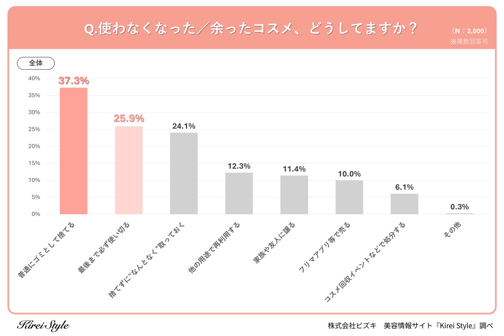 全国の20代~50代の女性2,000人を対象に、「使わなくなった/余ったコスメ、どうしてますか?」というアンケートを実施したところ、最も多かった回答は「普通にゴミとして捨てる」で37.3%となりました。次いで、「最後まで必ず使い切る」が25.9%、「捨てずに”なんとなく”取っておく」が24.1%と続く結果となりました。また、「その他」として「そもそもコスメを買わない」という回答が得られました。