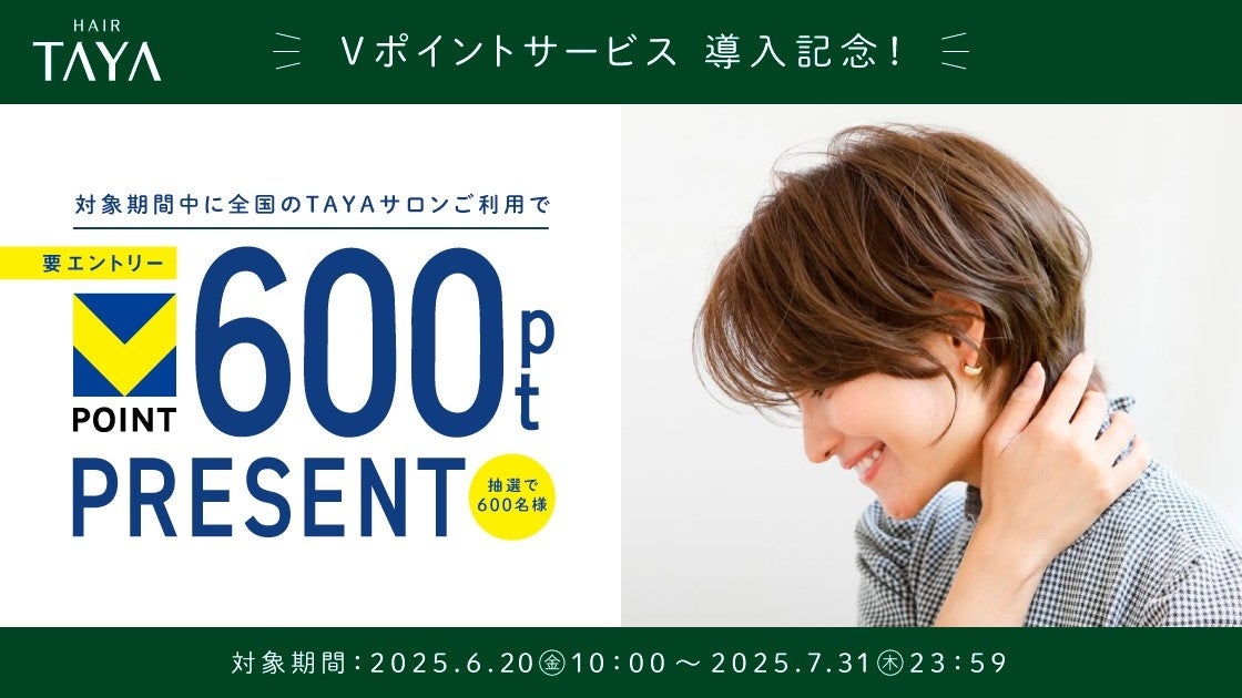 また、「美容室TAYA」でのVポイントサービス開始を記念し、抽選でVポイントが当たるキャンペーンを開催いたします。6月20日(金)~7月31日(木)の期間中、キャンペーンサイトからエントリーの上、「美容室TAYA」でサロンメニューをご利用時にVポイントが貯まるカードを提示いただくと、抽選で600名さまにVポイント600ポイントが当たります。ぜひこの機会に「美容室TAYA」の施術をご体験ください。