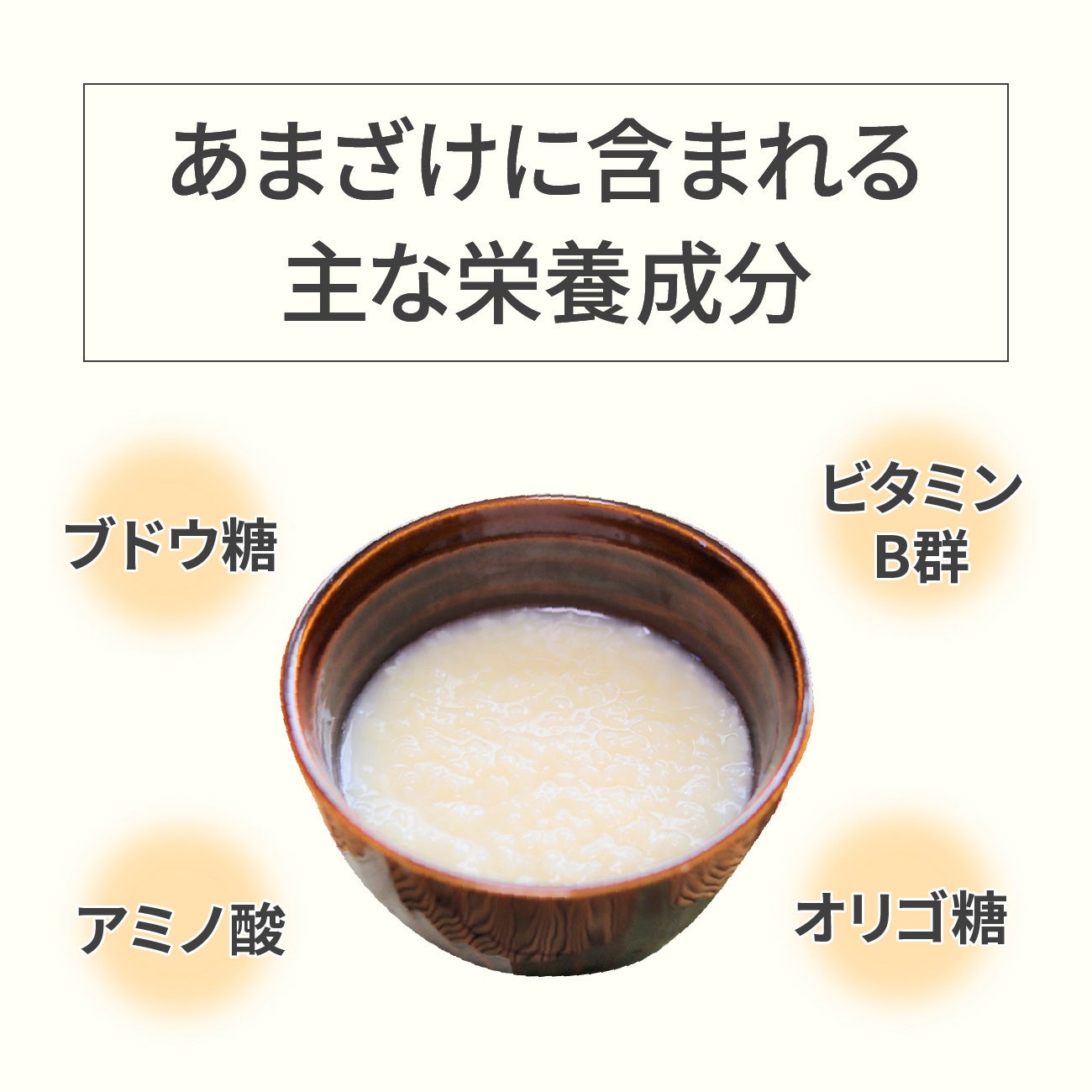 甘酒は米糀甘酒と酒粕甘酒に大別されます。米糀甘酒は、蒸した米、米糀、水でつくられ、通称「飲む点滴」とも呼ばれています。発酵過程で米糀の持つ酵素が米のでんぷんをブドウ糖や麦芽糖に分解し(糖化)、砂糖を使わずとも自然な甘さが引き出されます。また、アルコールを生成しないため、妊娠中の方やお子様でもお飲みいただけます。さらに、ブドウ糖や必須アミノ酸、ビタミンB群が豊富に含まれ、疲労感や免疫の維持など毎日の体調管理をサポートします。