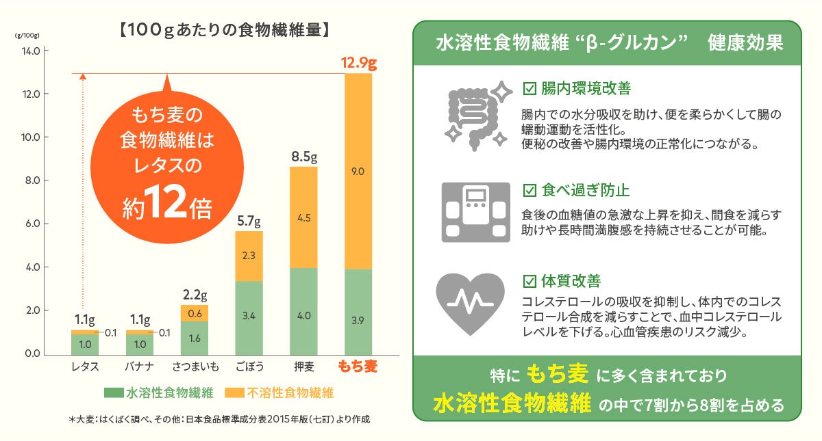 もち麦に含まれる食物繊維はごぼうの約2.2倍、レタスの約12倍と言われ、水溶性食物繊維「βグルカン」は、腸内環境改善、食べ過ぎ防止などのサポートに役立ちます。また体重管理に役立つ腸内細菌「ブラウティア」を増やすとも報告されており、普段の生活に手軽に腸活習慣を取り入れたい方におすすめです。