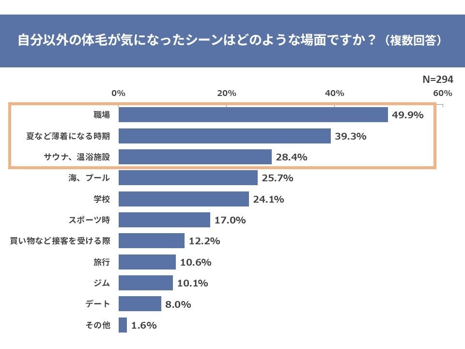 次に、“自分以外の男性の体毛”が気になったことがあるかと聞いたところ、「かなりある(9.0%)」と「たまにある(38.1%)」を合わせると47.1%と、半数近くが気になった経験があると回答しました。パナソニックが5月に発表した「男性の体毛ケアに関する意識調査」(※1)では、恋人・友人・職場の人など、男性に対して体毛ケアをしてほしいと思う女性は65%(※2)という結果がでています。今回の結果をみると、女性が感じているように、男性も自分以外の男性の体毛ケアが気になっていることがうかがえます。自分以外の男性の体毛が気になったシーンについて尋ねたところ、職場が49.9%と約半数の方が回答しました。次いで、夏など薄着になる時期が39.3%、サウナや温浴施設が28.4%となりました。