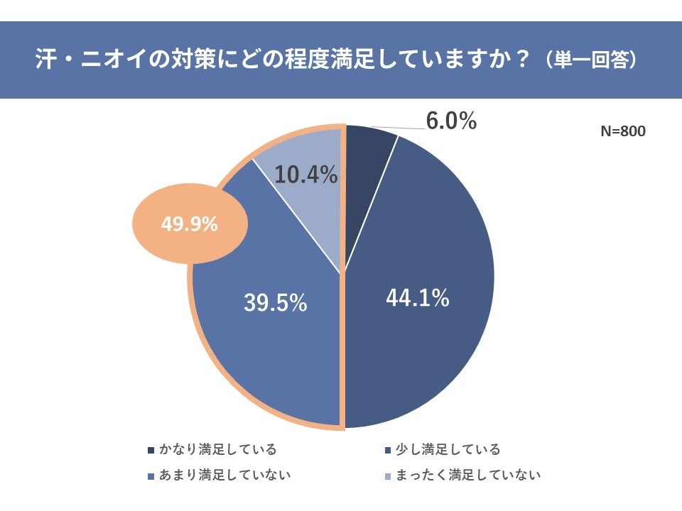 次に、現在行っている汗・ニオイ対策に満足しているかを聞いたところ、「あまり満足していない(39.5%)」「まったく満足していない(10.4%)」を合わせると49.9%の男性が満足していないことがわかりました。