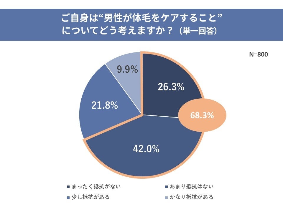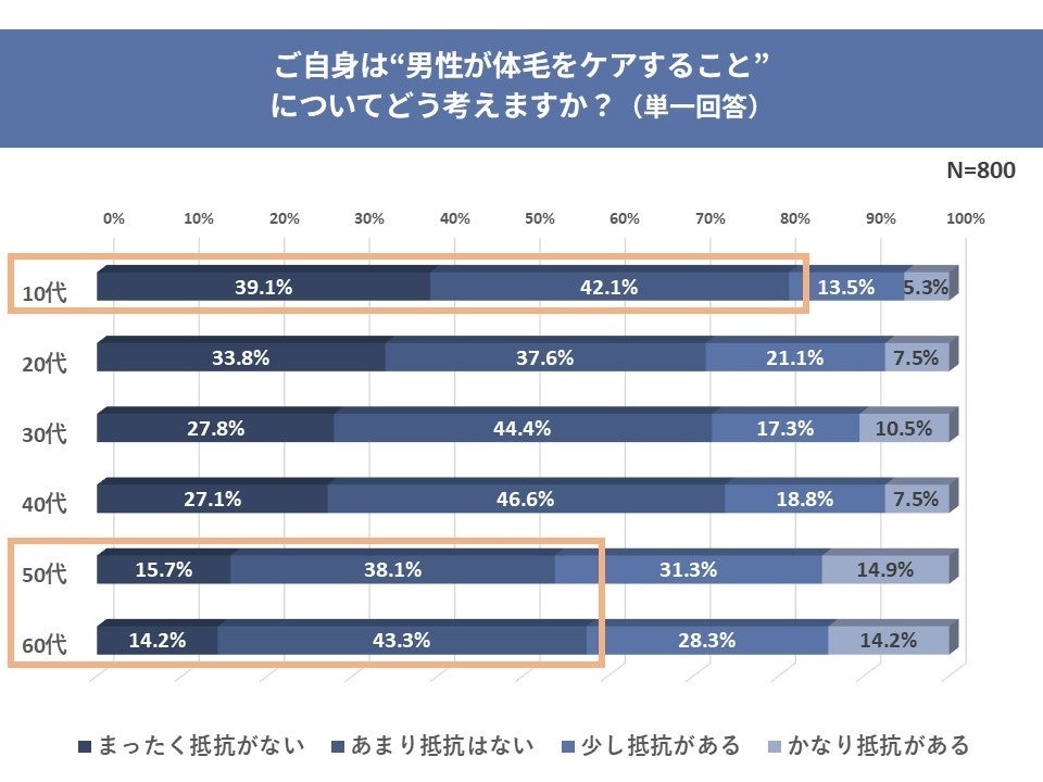 また、「男性が体毛ケアを行うことに対する抵抗感」について聞いたところ、「まったく抵抗がない(26.3%)」と「あまり抵抗がない(42.0%)」を合わせると68.3%で、約7割が抵抗がないことがわかりました。中でも50代、60代では抵抗がない方はおよそ半数という結果に対して、10代は8割を超えており、若年層を中心に“男性の体毛ケア”はスタンダードになりつつあることが明らかとなりました。