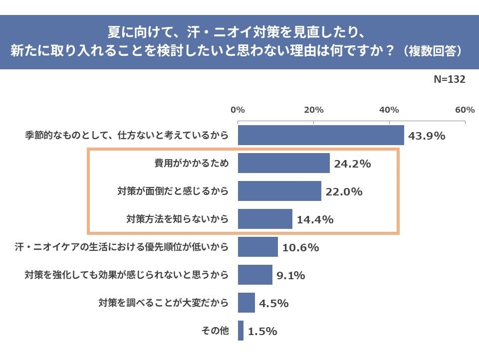 一方で検討したいと思わない男性は、検討しない理由として「季節的なものとして仕方ない」と諦めている人が多い中、「費用がかかる」「対策が面倒」「対策方法を知らない」という回答も多く、コストや手間、情報不足が障壁となっている実態が浮き彫りになりました。