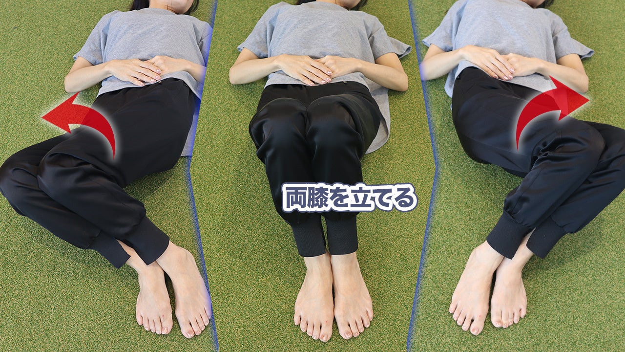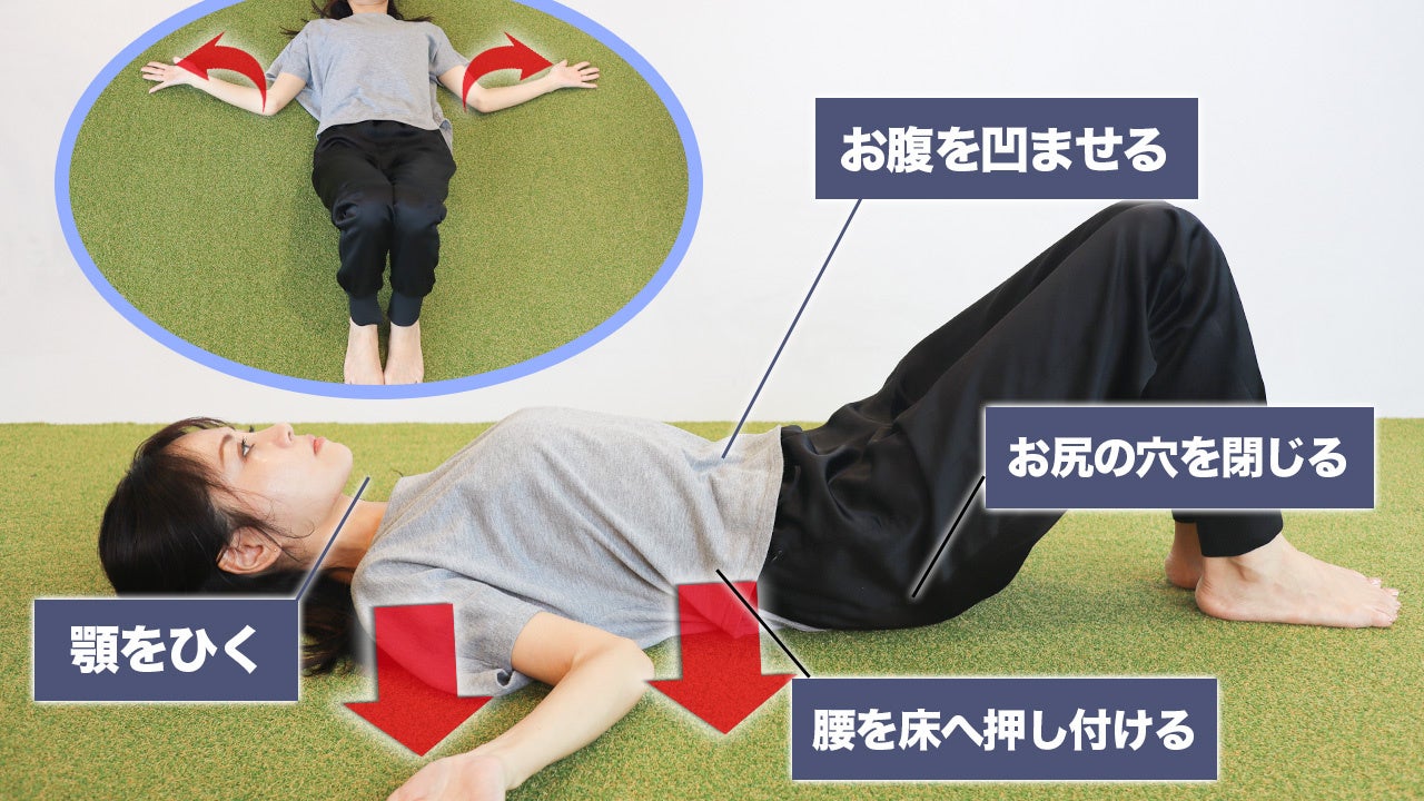 ①仰向け膝を立てて寝る→腕を外側に倒す→お尻の穴を閉じて顎を引く