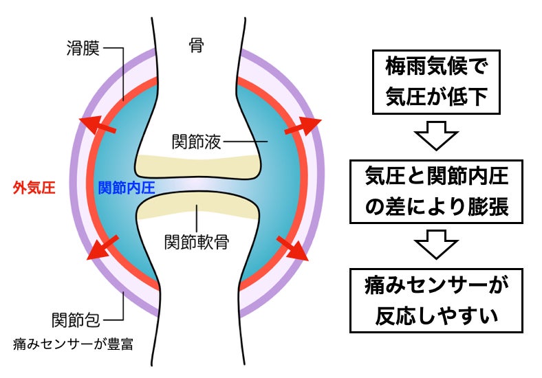 気圧が下がる梅雨時には、この外気圧と関節内の圧力に差が生まれます。すると関節包が外に向かって膨張しやすくなり、関節周囲に分布する痛みのセンサー(自由神経終末や圧受容)が刺激され、「ズーンとした重さ」「うずくような痛み」として感じやすくなるのです。