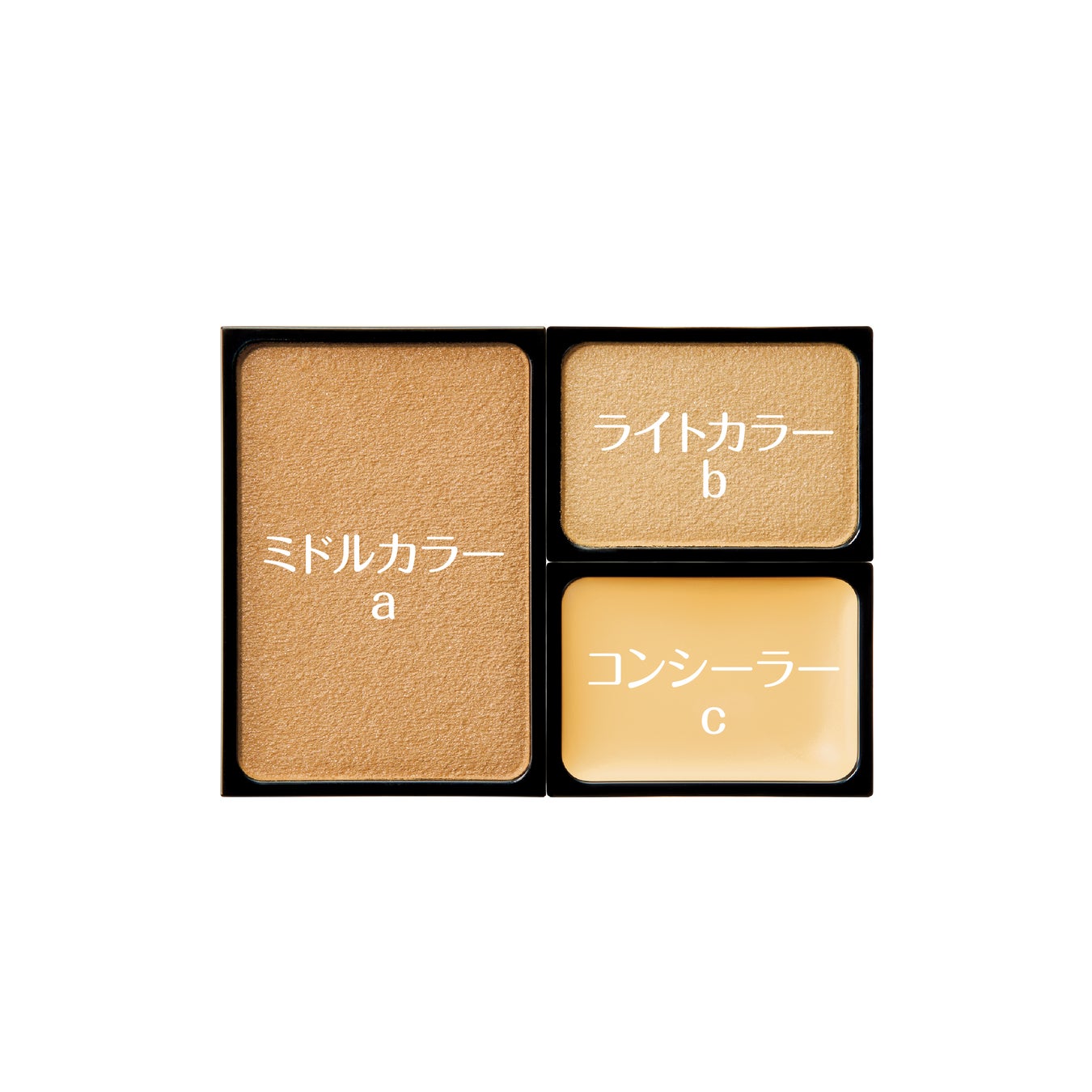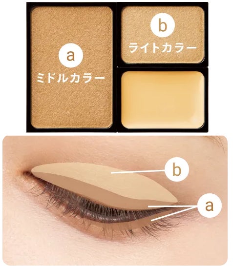 bをまぶた全体に塗り広げ、次にaを目尻や下まぶたキワに重ねます。ソフトマットな質感で、自然なグラデーションが目もとに深みを与えます。
