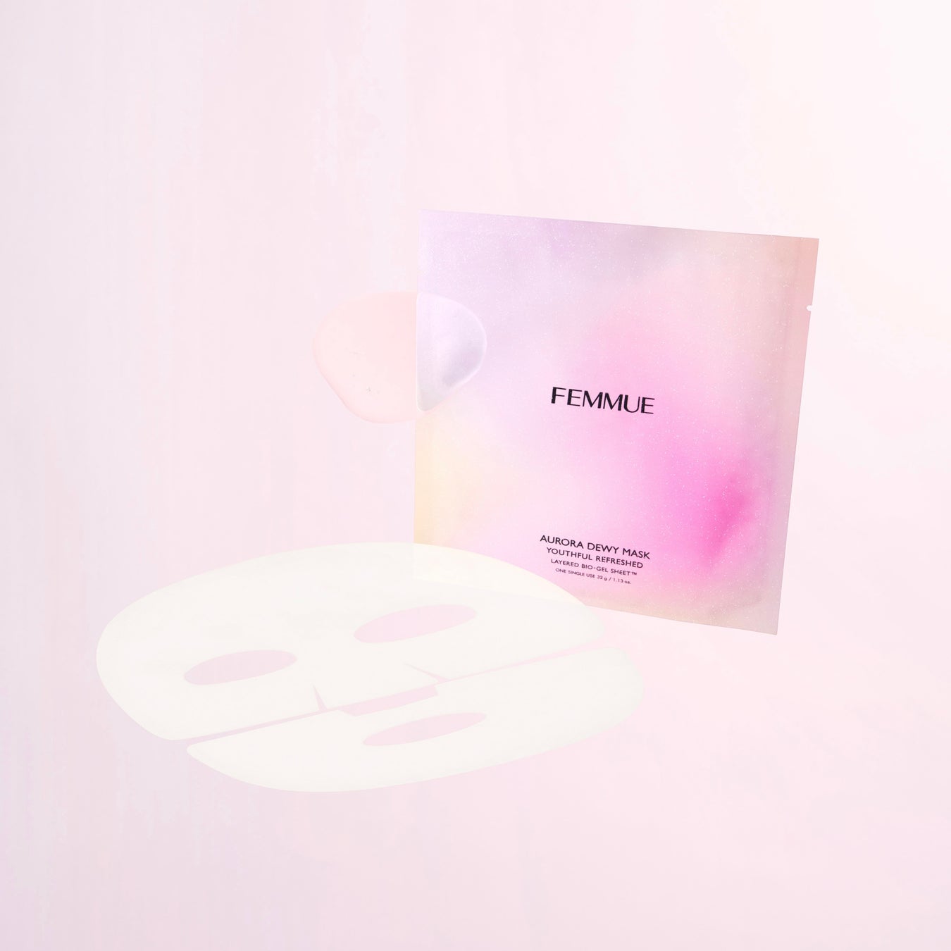 高温状態になった肌を冷却し、夜空を彩るオーロラのような輝きとハリを与えるシートマスク。サフランエキス*1が肌を落ち着かせてうるおいを保ち、ニンジン由来コラーゲン*2がハリを与え、表情も上向き印象へ。キメを整えて透明感*3のある肌に導くレチノール*4、ナイアシンアミド、8種のヒアルロン酸*5も配合。セルロース素材とハイドロゲル素材を組み合わせて新たに開発した、FEMMUE独自の二重構造シート「レイヤード バイオゲルシート」を採用。顔に密着して落ちにくく、美容成分をスムーズに浸透させます。ローズ*6とジャスミン*7の心満たすフローラルな香り。