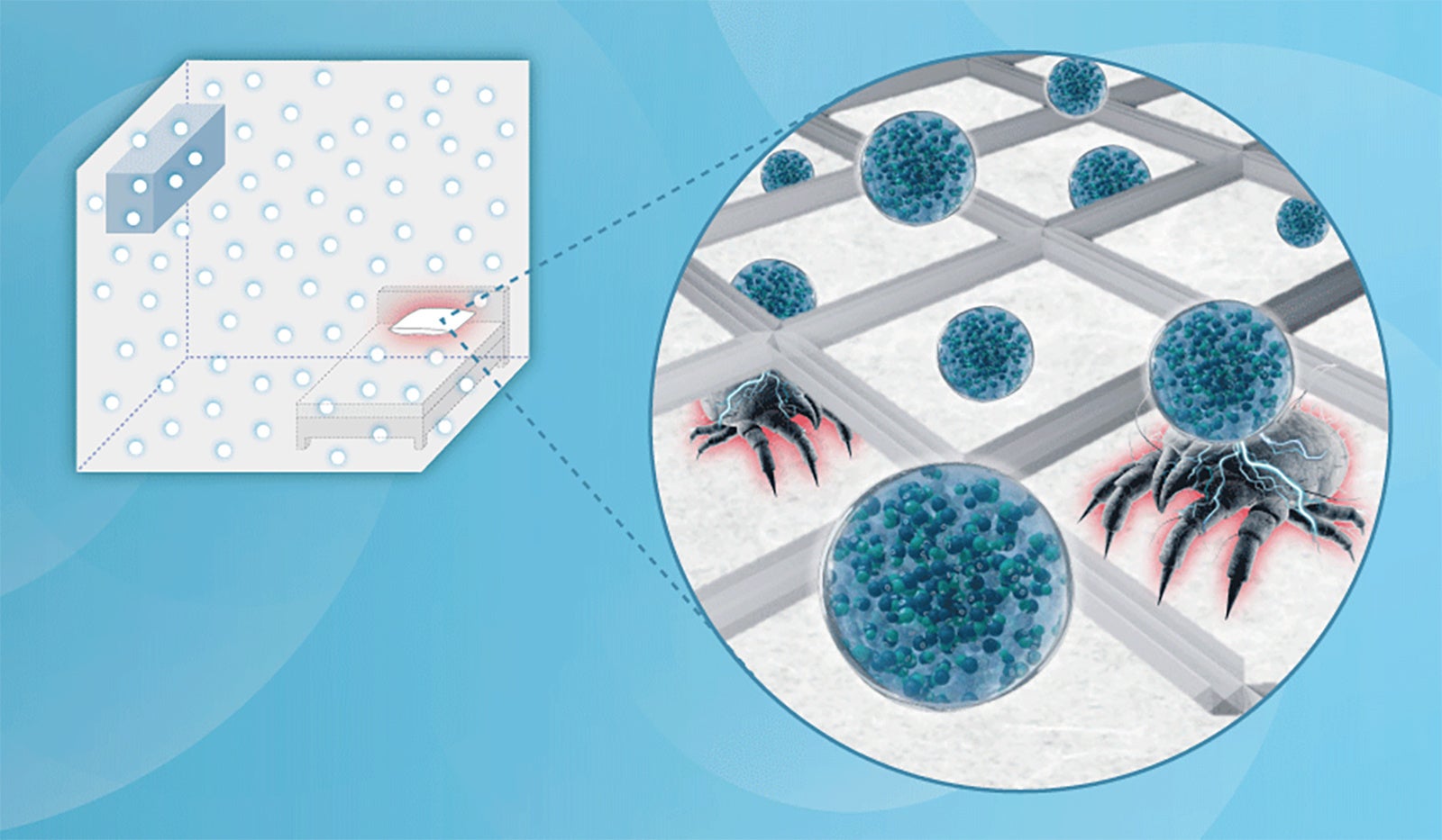 今回、ナノイー(帯電微粒子水)は髪の毛の10万分の1のナノサイズの粒子であることから、寝具の繊維に潜むダニアレルゲンまで抑制できるのではないかと考え、検証を行いました。その結果、今回の検証を通じて、新たに寝具の中に潜むダニアレルゲンを抑制するとともに、ダニアレルゲンによる、かゆみや炎症に関与する反応も抑えられていることも細胞レベルで確認。ナノイー(帯電微粒子水)技術は空間浄化を超えて、「睡眠環境の質」へも寄与しうる新たな可能性を見出しました。なお、本検証は後述の試験条件での結果であり、実使用空間における効果を検証したものではありません。