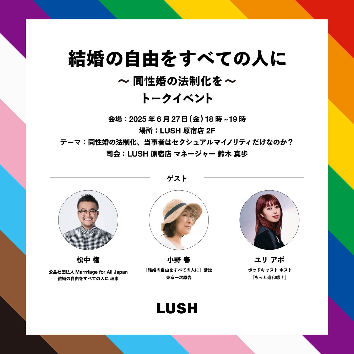 本キャンペーン開始に先駆け、6月27日(金)、LUSH 原宿店にて、「同性婚の法制化、当事者はセクシュアルマイノリティだけなのか?」をテーマにしたトークイベントを開催します。ゲストには、公益社団法人Marriage For All Japan – 結婚の自由をすべての人に 理事の松中 権氏、「結婚の自由をすべての人に」訴訟・東京一次原告の小野 春氏、ポッドキャスト「もっと違和感!」ホストのユリ・アボ氏の3人を迎え、来場者と共にインタラクティブなディスカッションを交えた1時間となります。