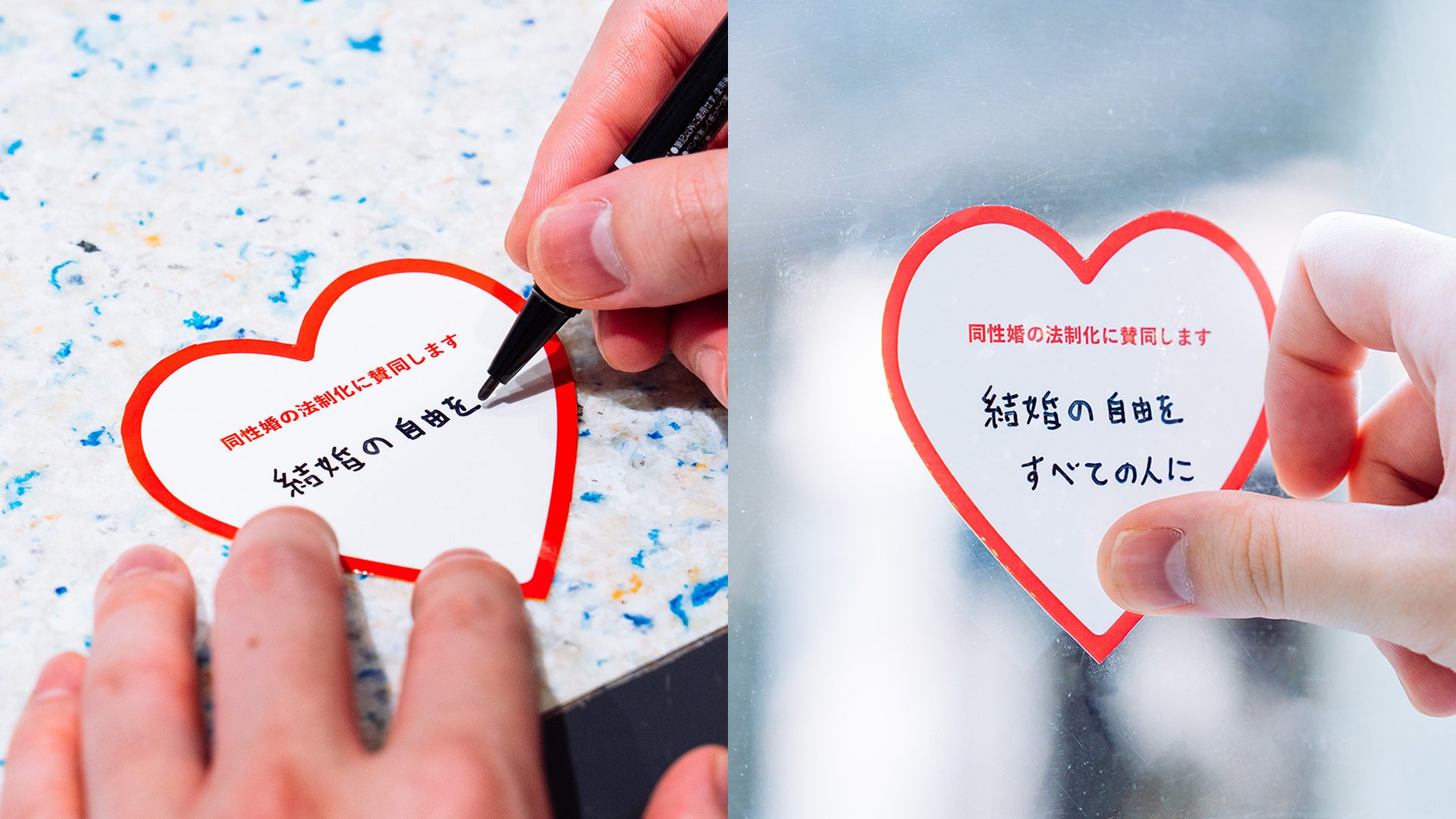 LUSH SPA 新宿店、LUSH 原宿店、LUSH 神戸三宮店の3店舗では、ハート型のシールに賛同する理由や同性婚の法制化に対する想いなどを手書きで書き、店内に貼っていきます