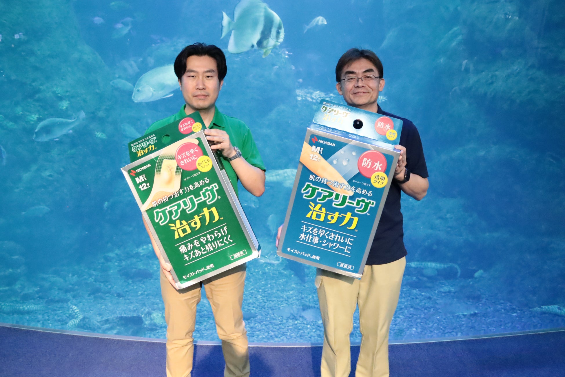 応急手当のために「ケアリーヴTM治す力TM」などの絆創膏と水をセットで持ち歩くこと、他に瞬間冷却パックや日焼け止め、帽子などが紹介されました。新江ノ島水族館の飼育スタッフの皆さんも使用されているという「ケアリーヴTM治す力TM」についても紹介し、本イベントを通して魚の命を守る水族館の取り組みや、人のキズの正しい手当て、生き物との付き合い方を親子で楽しく学んでいただきました。