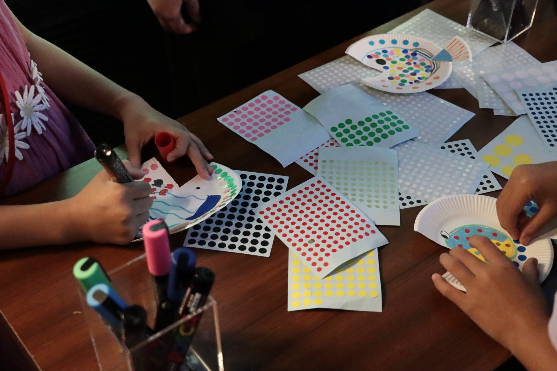 今回のイベントでは、ニチバンの「マイタックTMカラーラベル」を使って、大きなパネルに自由に魚を描いたり、魚型の紙皿をデザインしていただきました。「タコ」や「チンアナゴ」など、参加者の皆さんは自由な発想で新江ノ島水族館の魚たちを表現しました。