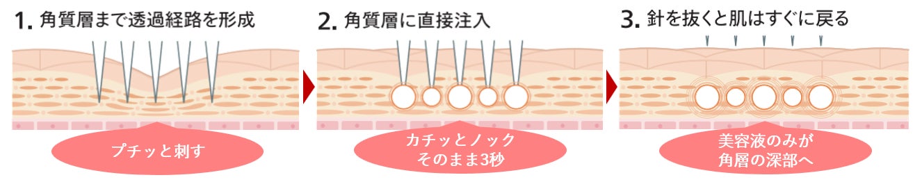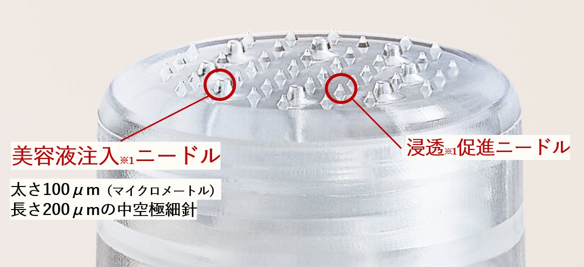 また、ノック注入※1型容器の先端には、直接角層に刺して美容成分を届ける注入ニードルと、角層内に効果的に美容液を導入する浸透※1促進ニードルが配置されており、2種類の極細針が肌の気になる部分の角層深くまで美容液を届けることで、肌に透明感※6を仕込み※1、内側まで※1発光しているような肌印象へと導きます。この注入型マイクロニードルは、医療用の「痛みを感じない注射針」の研究から着想して生まれました。