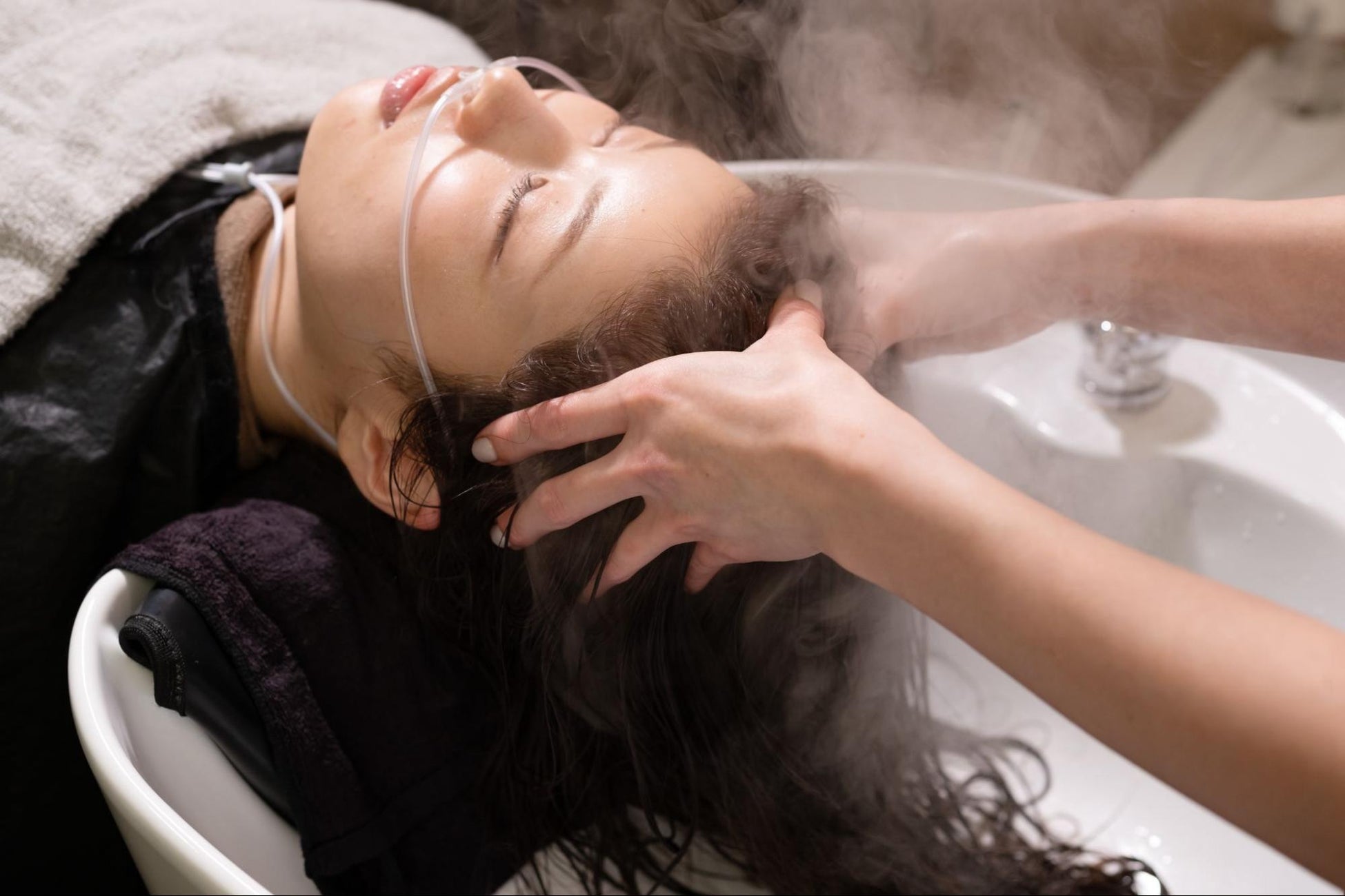 鍼灸師直伝のドライヘッドスパで首肩凝りケアを中心に眼輪筋や口輪筋をゆるめ、眼精疲労や食いしばりケアをたっぷり20 分行います。その後、しっかりインナートリートメントで美髪ケア、さらに無針水光注射で頭皮にヒト幹細胞培養液96% の美容液を注入。