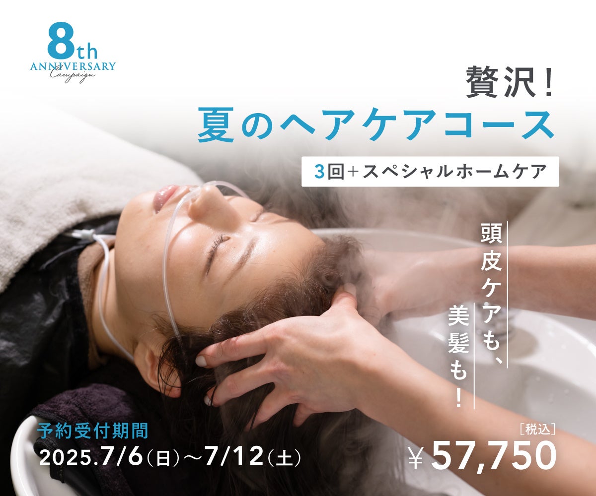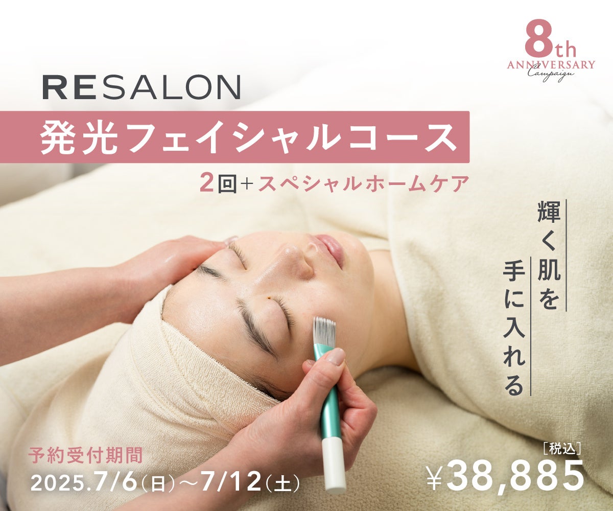 8周年を迎えたことを記念し、お客様への日頃の感謝を込めて2025年7月6日(日)より、お客様の「髪・頭皮」と「肌」それぞれの悩みにアプローチするキャンペーンとして、「贅沢!夏のヘアケアコース」と「RESALON発光フェイシャルコース」の2つの特別なコースをご用意いたしました。このキャンペーンを皮切りに、RESALONではおトクなキャンペーンを続々と実施予定となっておりますので、どうぞご期待ください。