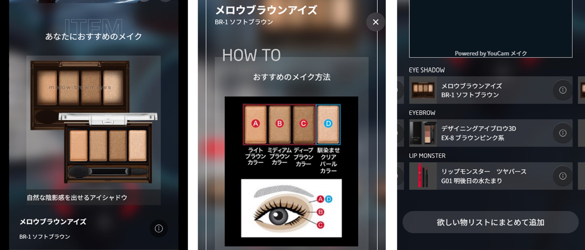 分析結果に基づき、KATEの提唱する「陰影メイク」に欠かせないアイシャドウやアイブロウなどの商品がリコメンドされます。さらに、Web上で実際に商品をお試しいただけるバーチャル体験や、各商品の効果的な使い方を分かりやすく解説したHowToコンテンツも充実。また、公式通販サイト「My Kao Mall」との連携により、気に入った商品はそのままスムーズにご購入いただけます。