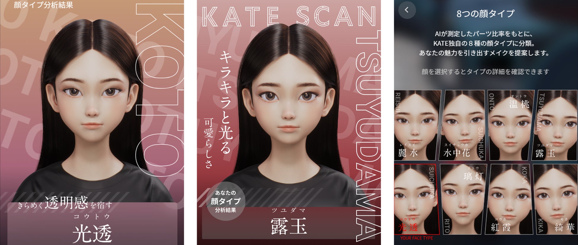 スマートフォンのカメラで顔をスキャンするだけで、「光透(KOTO)」「露玉(TSUYUDAMA)」などオリジナルの名前が付けられた全8パターンの顔タイプに分類。顔タイプとイラストは、全てリニューアルしました。分析結果のイラストは、ご自身のスマートフォンにダウンロードすることができ、各種SNSに投稿して頂けます。また、選択した取り入れたいアイメイクやリップの色によって背景の色が変わるので、何度も試したくなるコンテンツになっています。