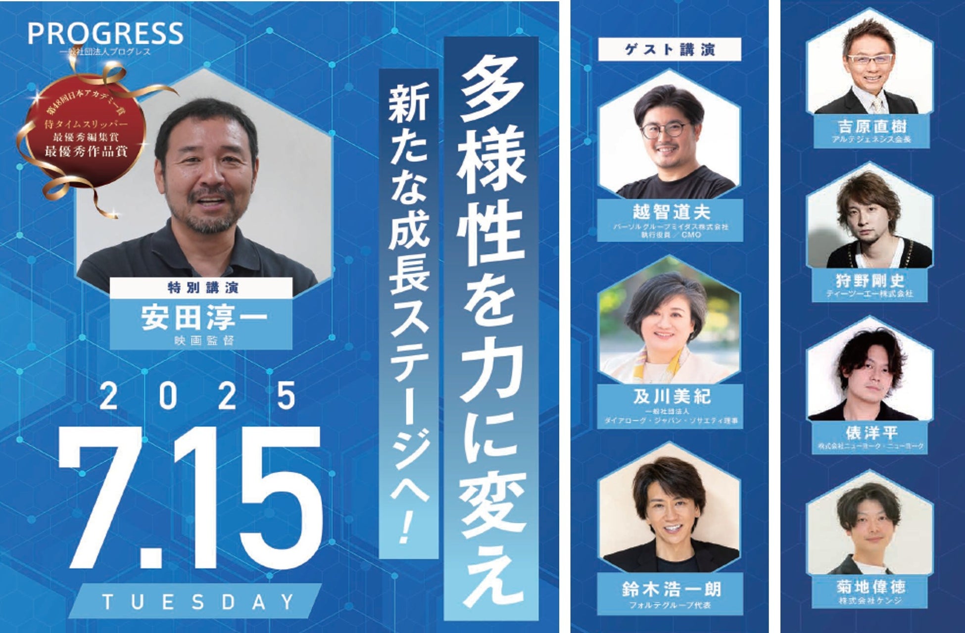 今年のテーマは『多様性を力に変え、新たな成長ステージへ!』です。これを軸に、3名のゲスト講師による講演に加え、プログレスに加入している企業から“ネクストリーダー”として学び・発信を行っている3名、プログレスの創設理事長である吉原直樹氏によるパネルディスカッションを実施いたします。経営・教育・文化など、多角的な視点から、未来の美容業界を見つめ直す1日となります。