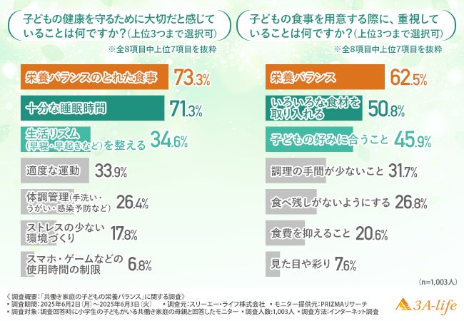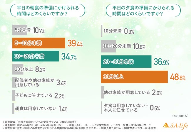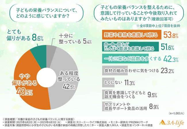 スリーエー・ライフ株式会社(所在地:東京都世田谷区、運営責任者:二宮 大次郎)は、小学生の子どもがいる共働き家庭の母親を対象に、「共働き家庭の子どもの栄養バランス」に関する調査を行いました。