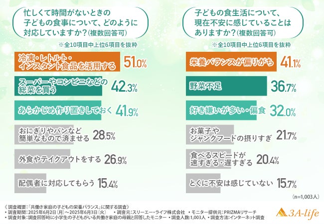 そこで今回、スリーエー・ライフ株式会社(https://www.3a-life.com/)は、小学生の子どもがいる共働き家庭の母親を対象に、「共働き家庭の子どもの栄養バランス」に関する調査を行いました。