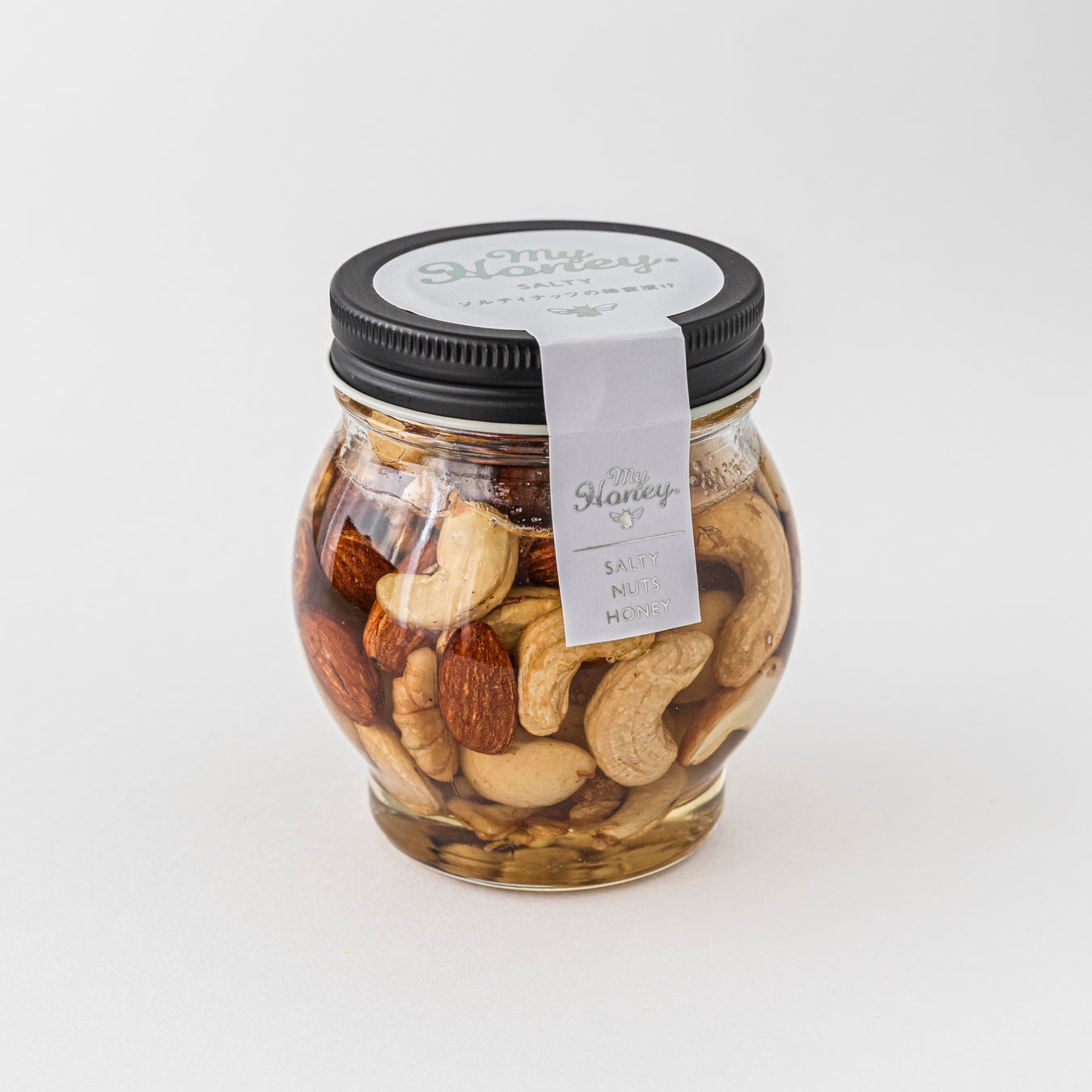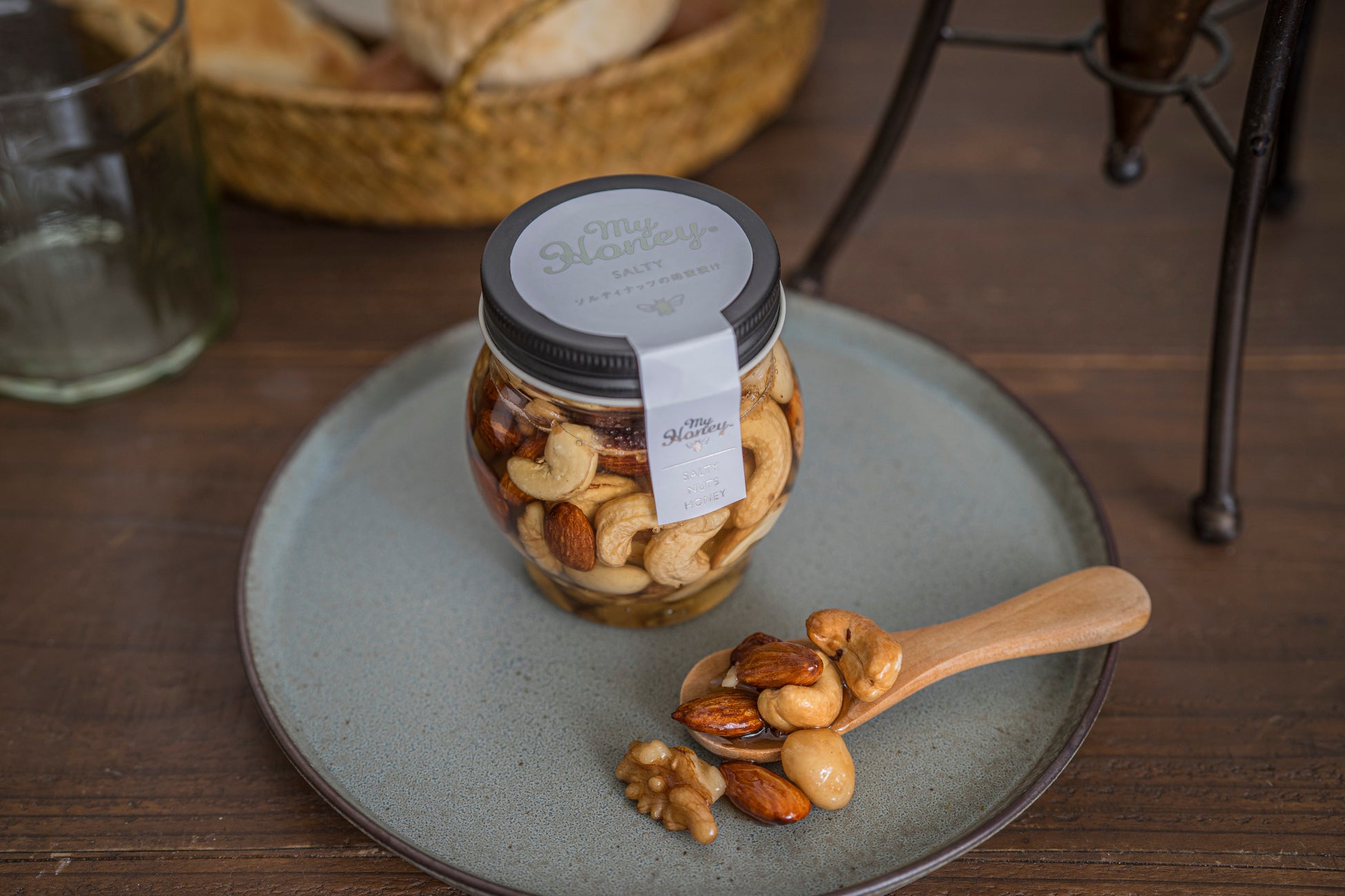 上野・アメ横の老舗ナッツ専門店「小島屋」の香ばしいナッツを、MYHONEY自慢の非加熱アカシアはちみつで丁寧に漬け込み、さらに“まろやかな旨み”が特徴の「赤穂の天塩」を加えました。