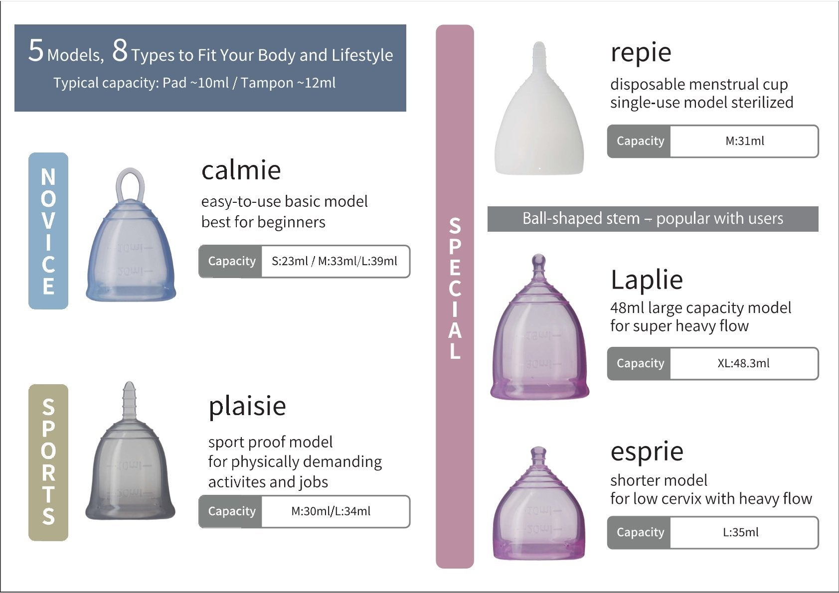 滑らかな表面加工により装着や取り出しがスムーズで快適な使用感を実現。清潔に保管できる専用ケースも付属しています。サイズやモデルは全8種類を展開し、使用者の体型や経血量、ライフスタイルに合わせた選択が可能です。