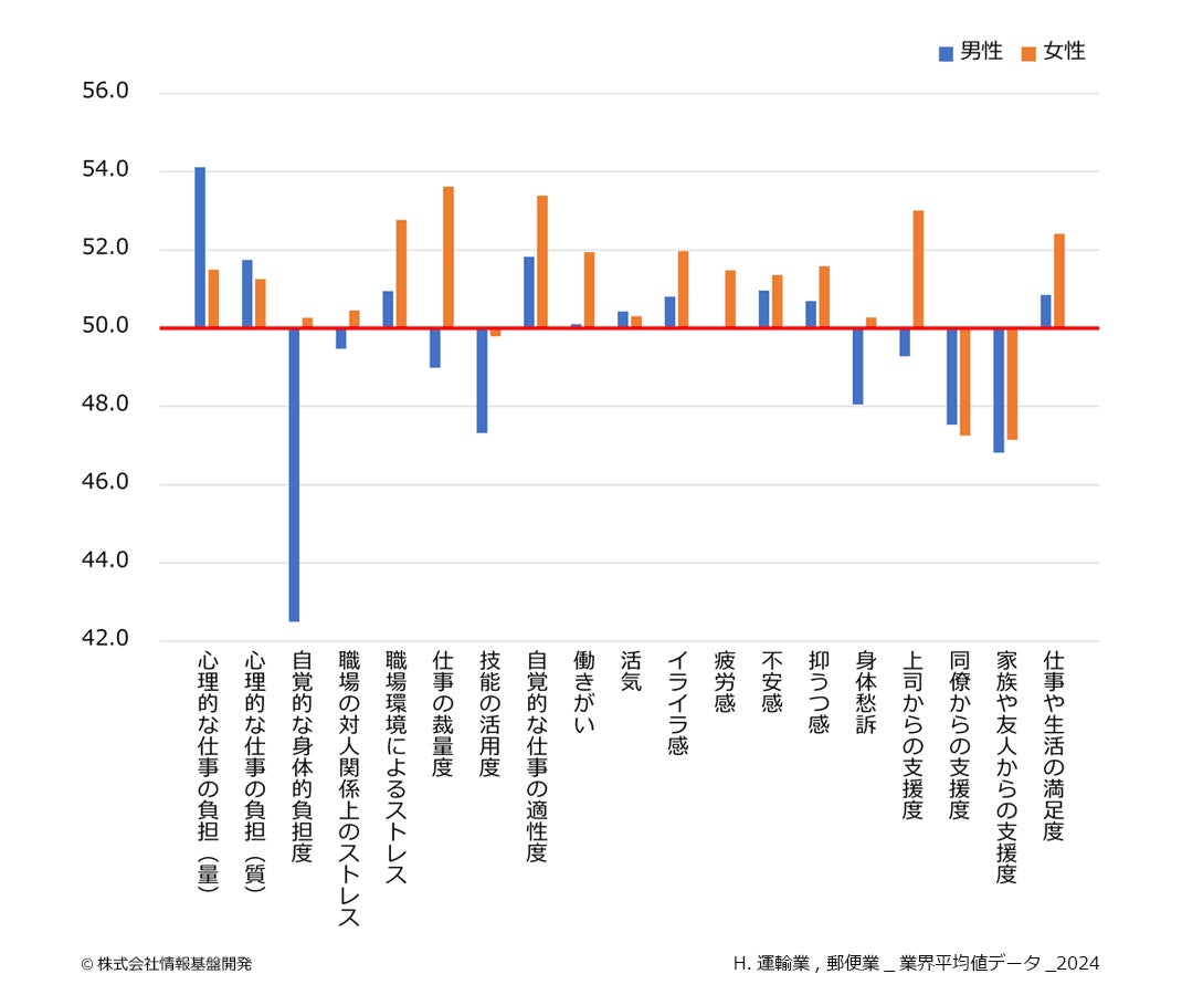 上記は、「運輸業, 郵便業」のストレスチェックの各尺度の数値(偏差値)を表しています。