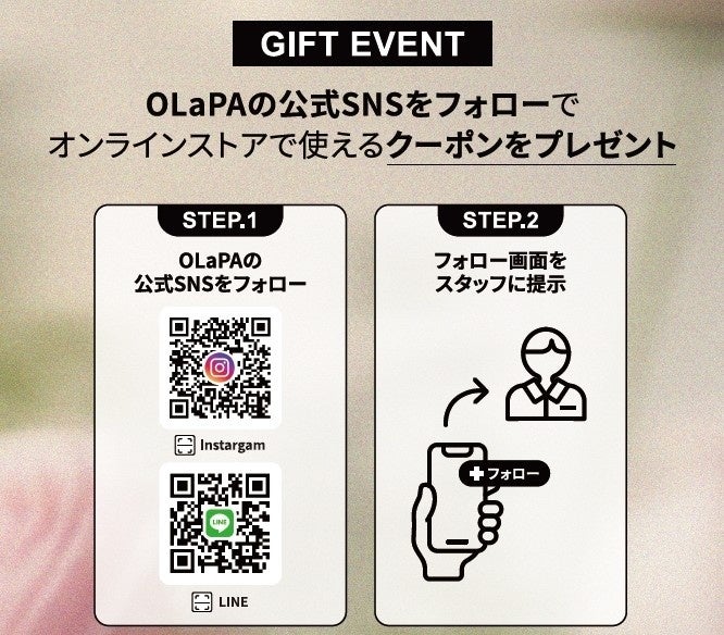 OLaPAの公式SNSのフォロー画面をスタッフに提示いただくと、OLaPA公式サイトで利用できる限定クーポンをプレゼント!さらに、クーポンご利用のお客様だけの限定プレゼントも…