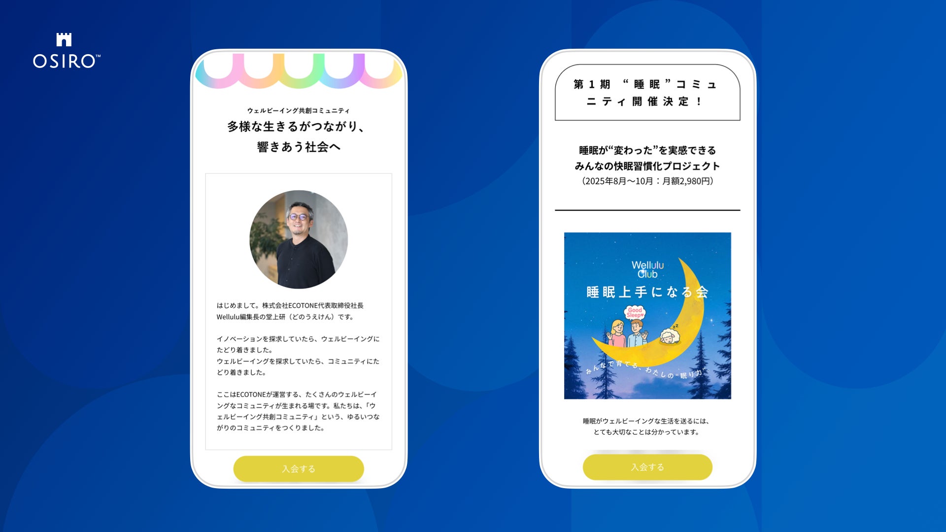 コミュニティ専用オウンドプラットフォーム「OSIRO」を提供するオシロ株式会社(本社:東京都渋谷区、代表取締役社長:杉山 博一、以下 オシロ)は、株式会社ECOTONE(本社:東京都 代表取締役社長:堂上研)に「OSIRO」の提供を開始。オンラインコミュニティ「Wellulu Club」をオープンします。第1弾として2025年8月よりスタートする、睡眠が“変わった”を実感できるみんなの快眠習慣化プロジェクトの実施に伴い、2025年7月14日よりコミュニティメンバー1期生の入会募集を開始します。