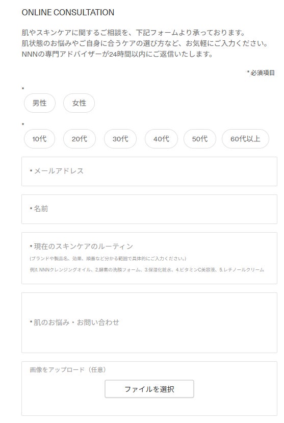 カウンセリングフォームに年代や現在のスキンケアルーティン、使用しているスキンケア、肌についてのお悩みや気になること、現在の肌の状態の画像などをアップロードして送ると