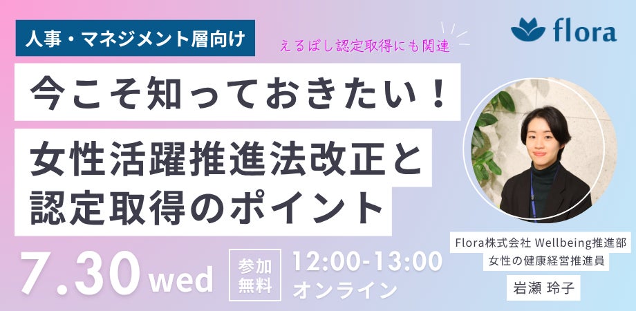 企業向けに性別特有の課題支援を行うFlora株式会社は、7月30日(水)12:00-13:00に女性活躍推進法の改正内容と対応のポイントを1時間でわかりやすく解説するウェビナーを開催します。