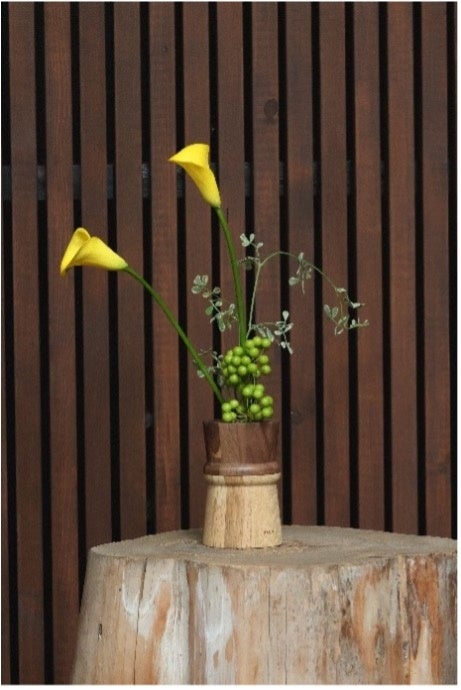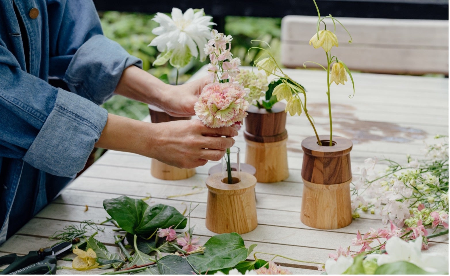 ウォルナットとオークの2樹種を用いた、上下二つのパーツからなるデザインの木製パーツは、切り株から心地よい樹木が香りたつ様をイメージ。カリモク家具とのコラボレーションにより、家具製造過程で発生する小さな木材(端材)をアップサイクルして使用。一つ一つ異なる個性豊かな樹木の表情が、日々の暮らしを彩ります。上下の組み合わせを変更することにより、異なるフォルムをお楽しみいただけます。また、使用後は、フラワーベースやオブジェなどとしてリユースいただけます。