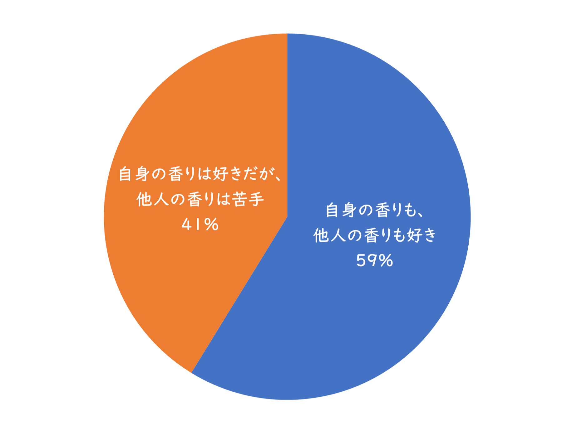 調査によると、人工的な香料による不快や体調不良を感じたことがある人は全体のそれぞれ77%、45%と過去6 年間の調査において最高にのぼりました。79%の人が何かしら香料入りの製品を日常的に使用しており、中でも柔軟剤、シャンプー・スタイリング剤の使用が多いという結果でした。柔軟剤の香りについて聞いたところ、41%が「自分の柔軟剤の香りは好きだが、他人の柔軟剤の香りは苦手」と回答、「自分および他人の柔軟剤の香りが好き」と回答したのは59%でした。