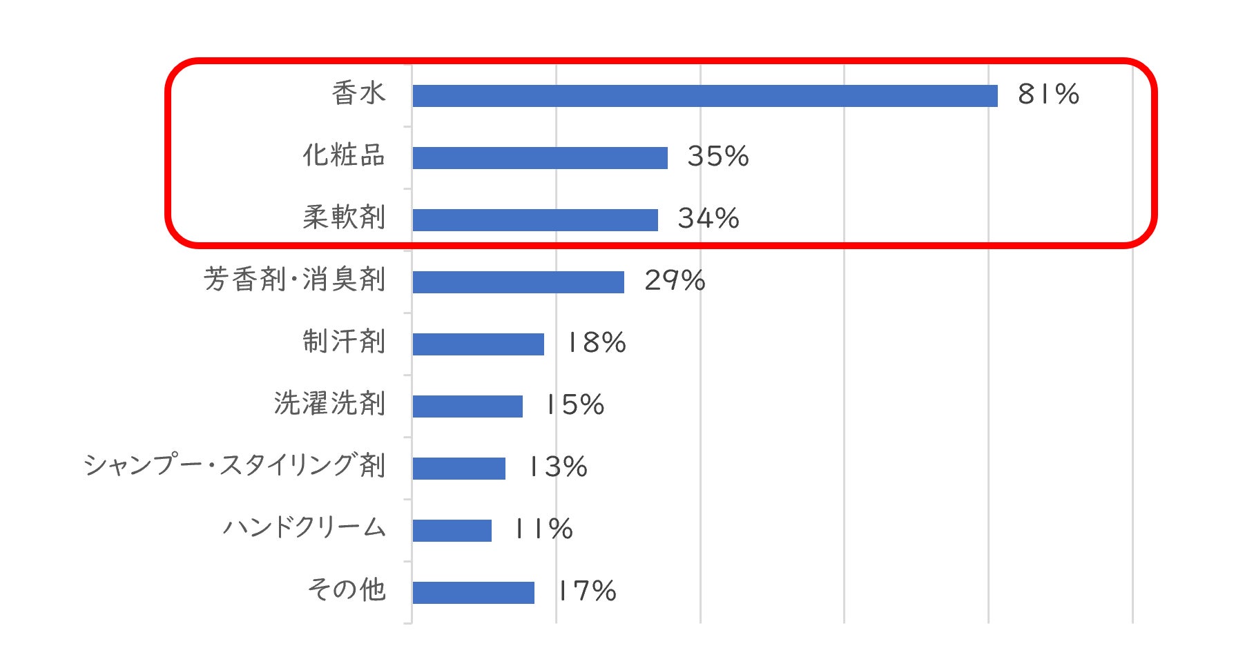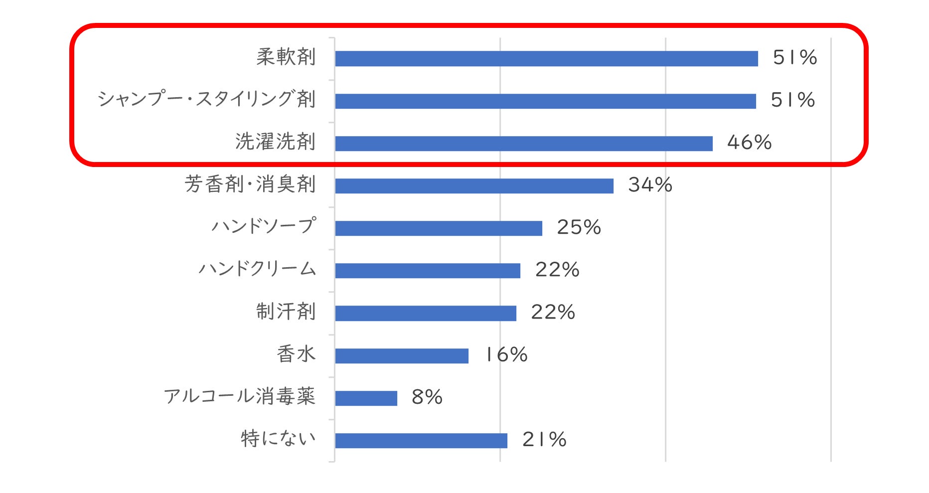 79%が香料入りの製品を日常的に使用。頻度が高いのは柔軟剤、シャンプー、スタイリング剤