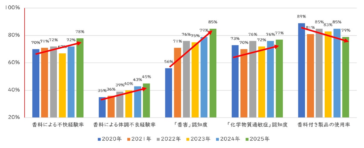 ● 「香料による体調不良経験率」は毎年増加しており、健康への影響拡大が考えられる