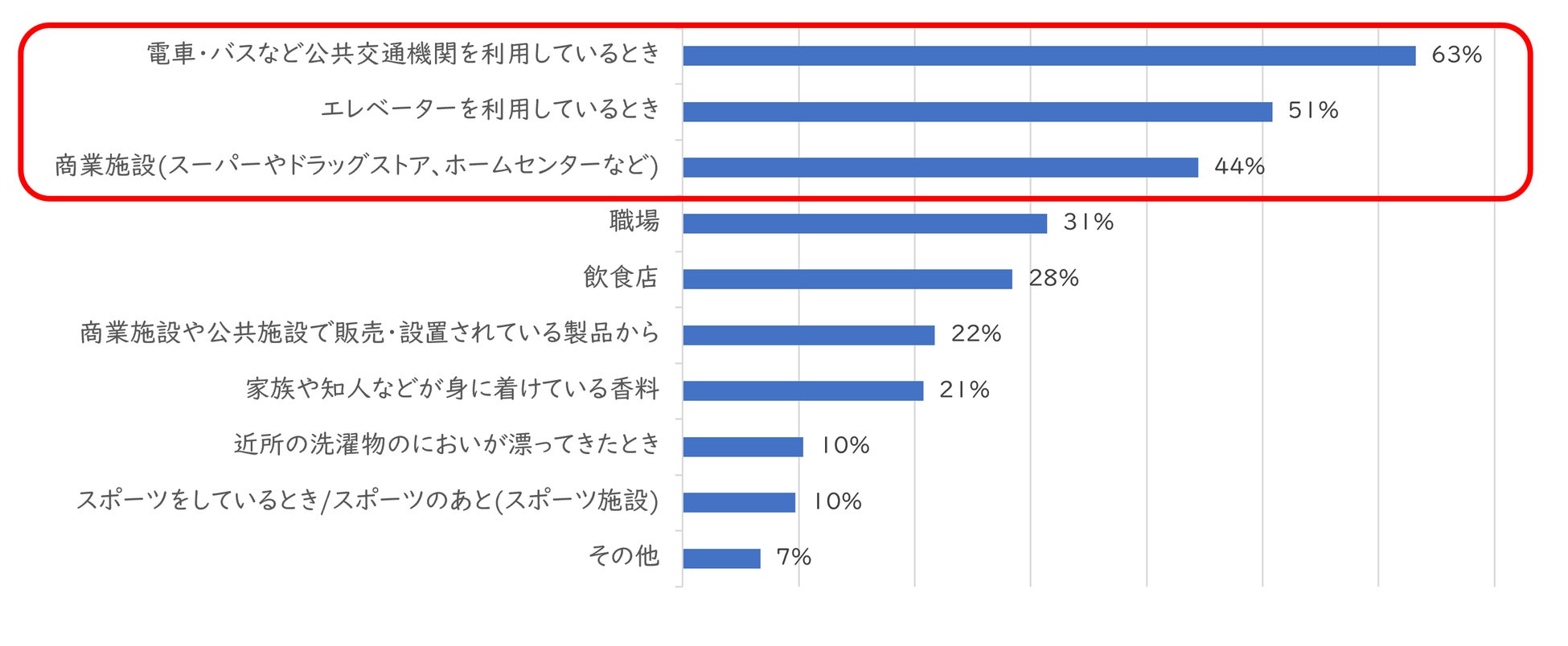 ② 不快に感じる場面は「電車・バスなど公共交通機関の利用時」「エレベーターの利用時」が最多で、不快に感じる香料は「香水」「化粧品」「柔軟剤」
